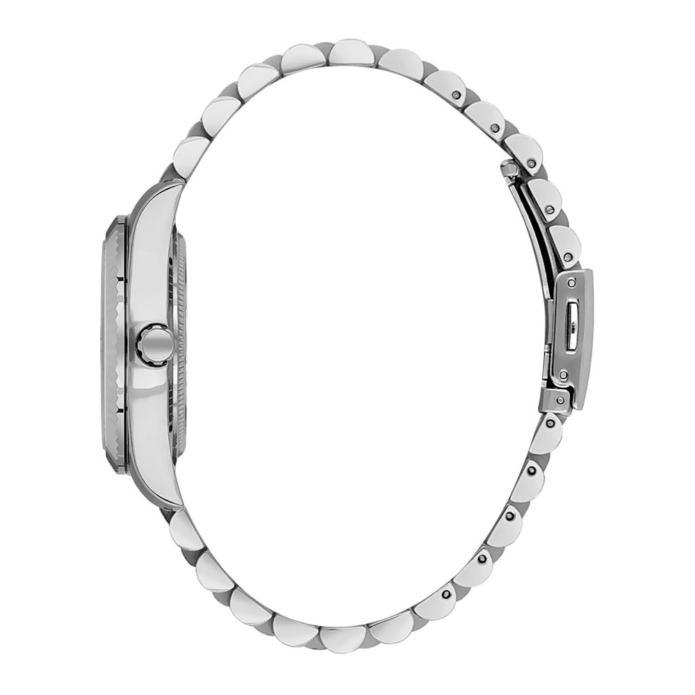 Женские кварцевые часы. Калибр механизма 2115. Центральные часовая, минутная и секундная стрелки. Апертура даты с увеличительным стеклом в позиции 3 часов. Бежевый циферблат украшен кристаллами. Круглый корпус выполнен из нержавеющей стали. Диаметр корпуса составляет 36 мм. Стальной браслет, раскладывающаяся застежка. Прочное минеральное стекло устойчивое к мелким механическим повреждениям. Водостойкость WR 50 (мытье рук, дождь).