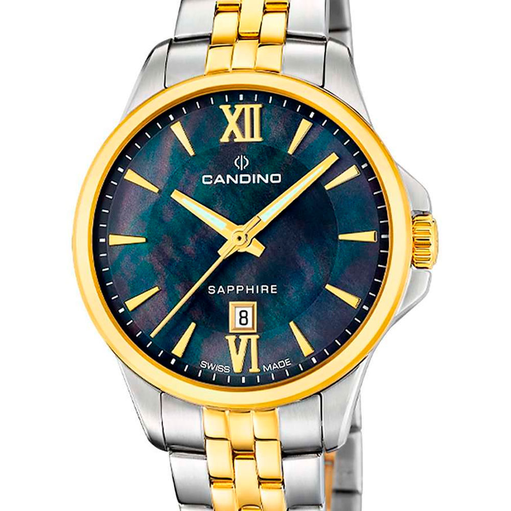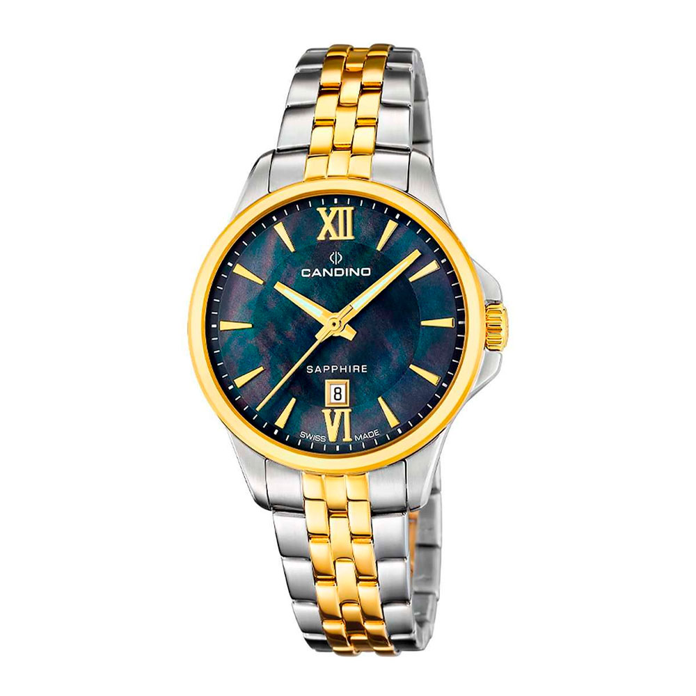 Женские наручные часы Candino C4767/7 из коллекции Lady Elegance сочетают в себе элегантный дизайн и надежность современных технологий. Модель обладает круглым корпусом диаметром 34 мм, изготовленным из нержавеющей стали, что обеспечивает высокую устойчивость к внешним воздействиям . Браслет выполнен из металла с частичным PVD-покрытием и с раскладной застежкой, гарантирующей комфортное ношение и безопасность . Перламутровый синий циферблат оснащен окном даты, а стрелки и метки имеют люминесцентное покрытие, обеспечивающее видимость в темноте . Безель с PVD-покрытием. Для защиты используется сапфировое стекло, которое противостоит появлению царапин и обеспечивает длительную сохранность внешнего вида часов . Часы работают на кварцевом механизме, что гарантирует точное время без необходимости подзаводки . Водонепроницаемость часов достигает 5 атмосфер (50 метров), что позволяет использовать их во время повседневных водных процедур, однако не рекомендуется для плавания или дайвинга .