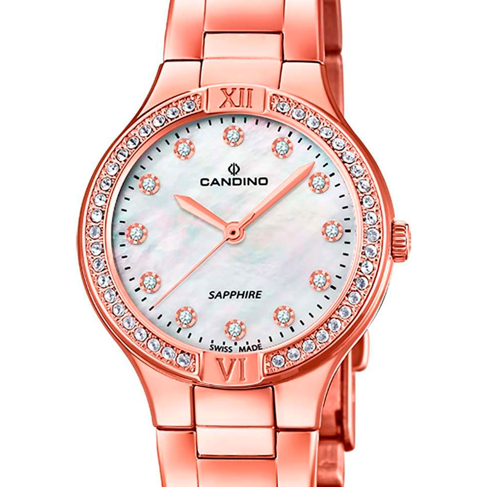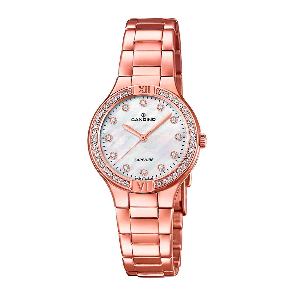 Женские наручные часы Candino C4630/2 из коллекции Lady Petite сочетают в себе элегантный дизайн и надежность швейцарского качества. Модель обладает круглым корпусом диаметром 30 мм, выполненным из нержавеющей стали с золотистым PVD-покрытием, что придает часам благородный вид и устойчивость к внешним воздействиям . Циферблат перламутрового оттенка украшен цирконием, подчеркивающими изысканность модели. Для защиты используется сапфировое стекло, обеспечивающее высокую устойчивость к царапинам и сохраняющее прозрачность . Браслет изготовлен из того же материала с раскладной застежкой, гарантирующей комфортное ношение и безопасность. Часы оснащены кварцевым механизмом, который работает от батарейки, обеспечивая точность хода без необходимости дополнительного обслуживания . Водонепроницаемость модели составляет 5 атмосфер (50 метров), что позволяет использовать их в повседневной жизни, включая контакт с водой, например, при мытье рук .