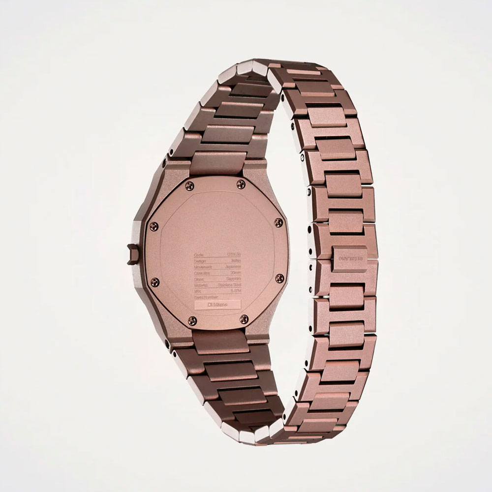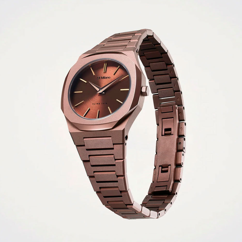 Женские часы Chocolush. Ультратонкие. Круглый стальной корпус. Циферблат с метками в виде штрихов. Клиновидные стрелки в стиле Dauphine. Секундная стрелка отсутствует. Задняя крышка крепится на 8-ми винтах. Индивидуальный серийный номер. Браслет с раскладывающейся застежкой.