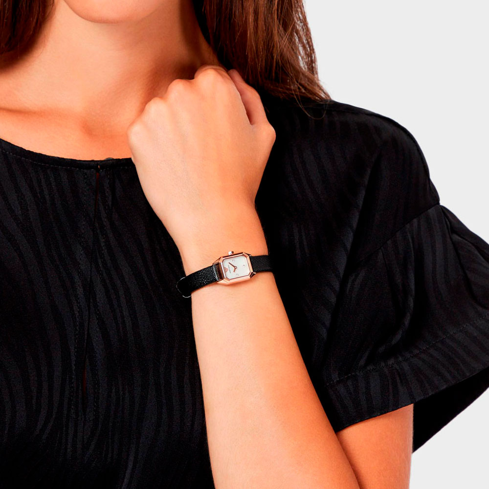 Изящные женские часы Gioia с прямоугольным стальным корпусом. Ультратонкие. Перламутровый циферблат с кристальными метками. Черный кожаный ремешок с классической застежкой.