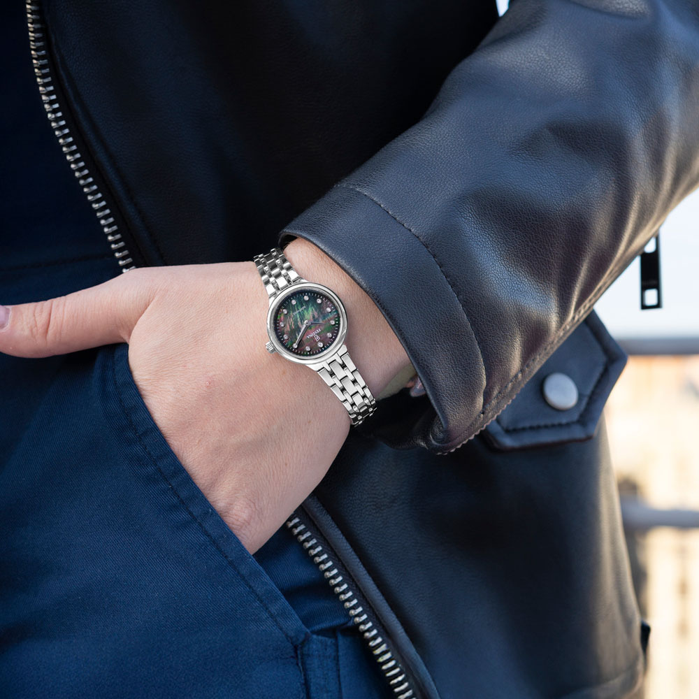 Женские кварцевые часы. Калибр механизма Miyota GL22. Центральные часовая и минутная стрелки. Черный перламутровый циферблат украшен цирконами. Круглый корпус выполнен из нержавеющей стали. Диаметр корпуса составляет 26 мм, толщина 6,7 мм. Стальной браслет шириной 12 мм, раскладывающаяся застежка. Прочное минеральное стекло устойчивое к мелким механическим повреждениям. Водостойкость WR 50 (мытье рук, дождь).