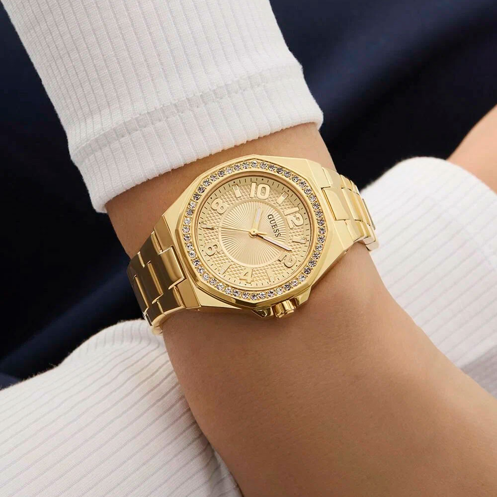 Женская кварцевая модель GW0877L2. Стальной корпус диаметром 34 мм c PVD покрытием. Корпус украшен Австрийскими кристаллами Stellux. Метки в виде арабских цифр и индексов. Минеральное стекло. Раскладывающаяся застежка с кнопками с двух сторон.