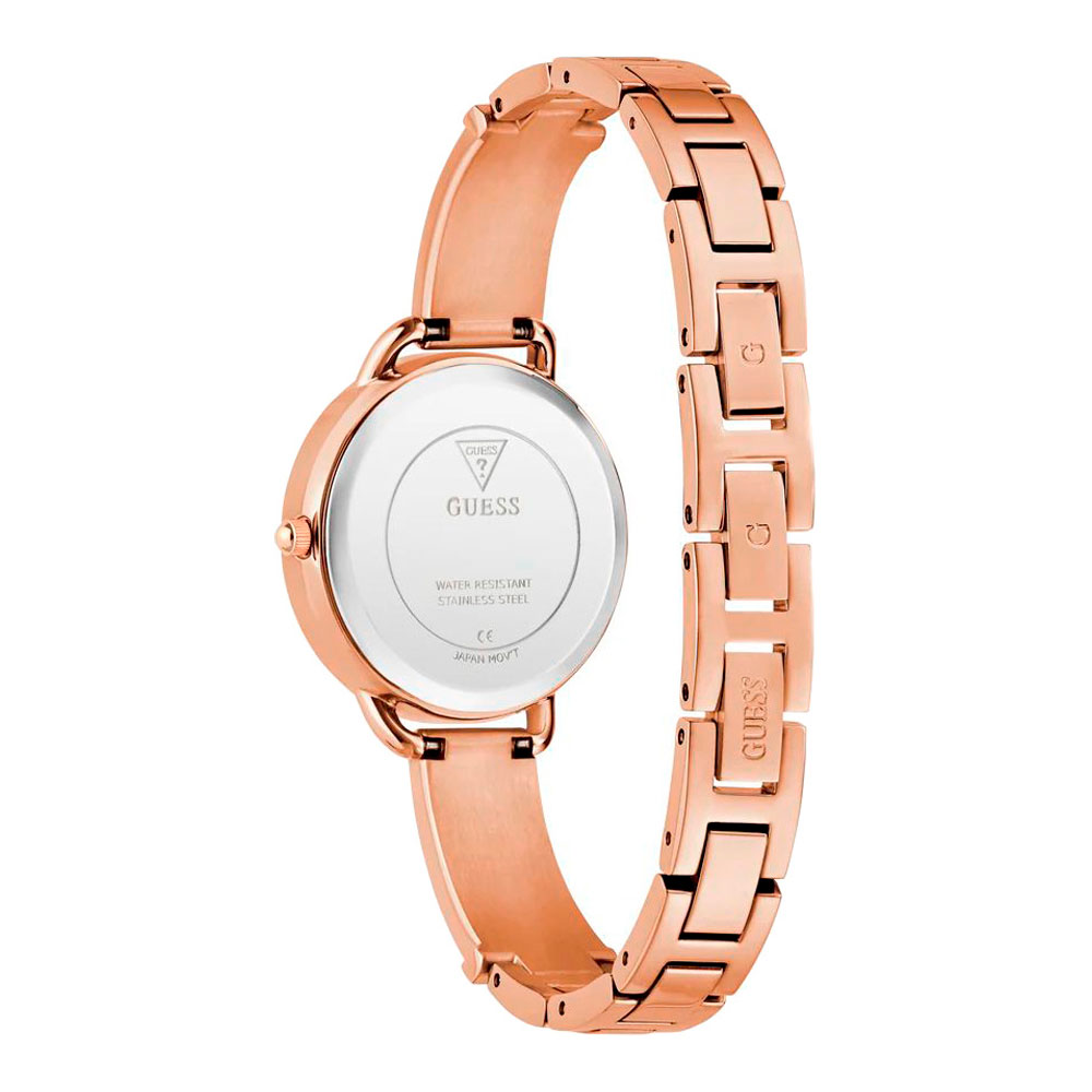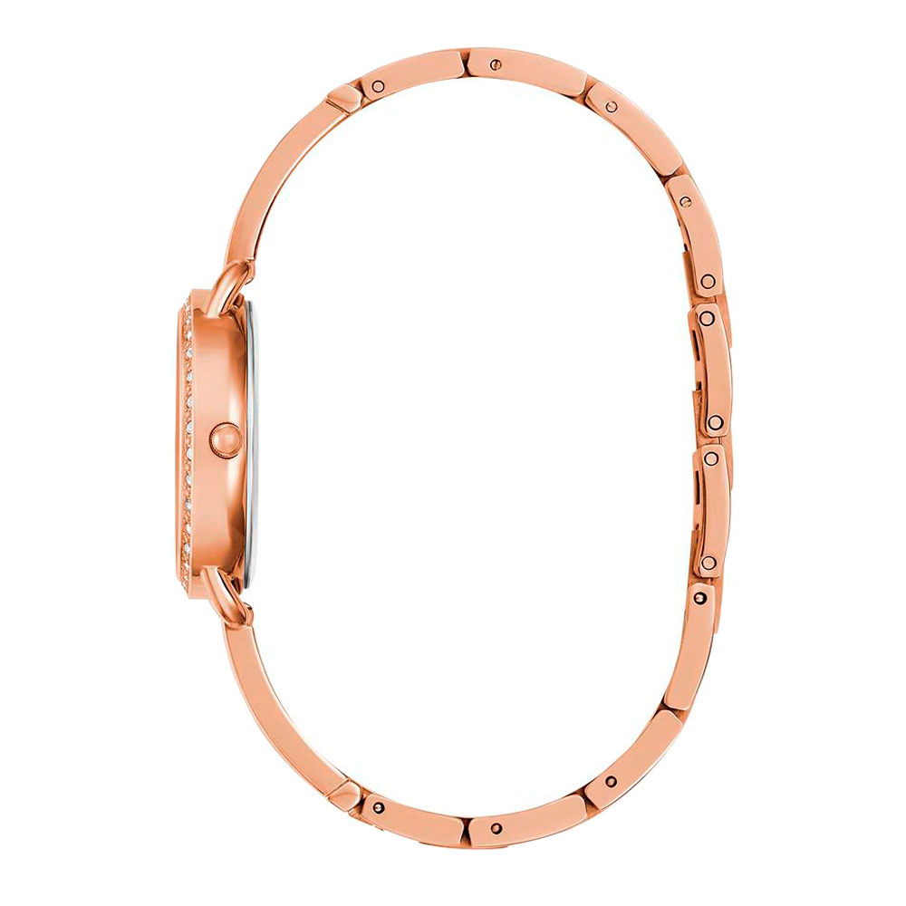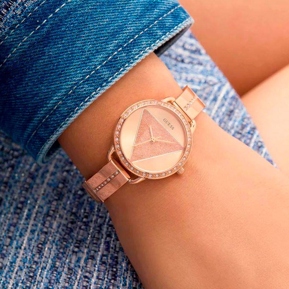 Женские кварцевые часы Tri Bellini — аксессуар, сочетающий в себе простоту и современный стиль. Круглый стальной корпус с розовым IP покрытием. Безель декорирован кристальным паве. Циферблат без меток с глиттерным треугольником по центру и логотипом GUESS выполнен по технологии Sunray (солнечные лучи) и защищен минеральным стеклом. Рифленая заводная головка. Стальной браслет с розовым IP покрытием декорирован кристаллами.