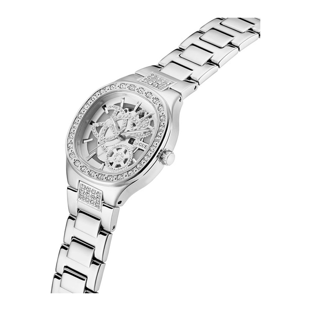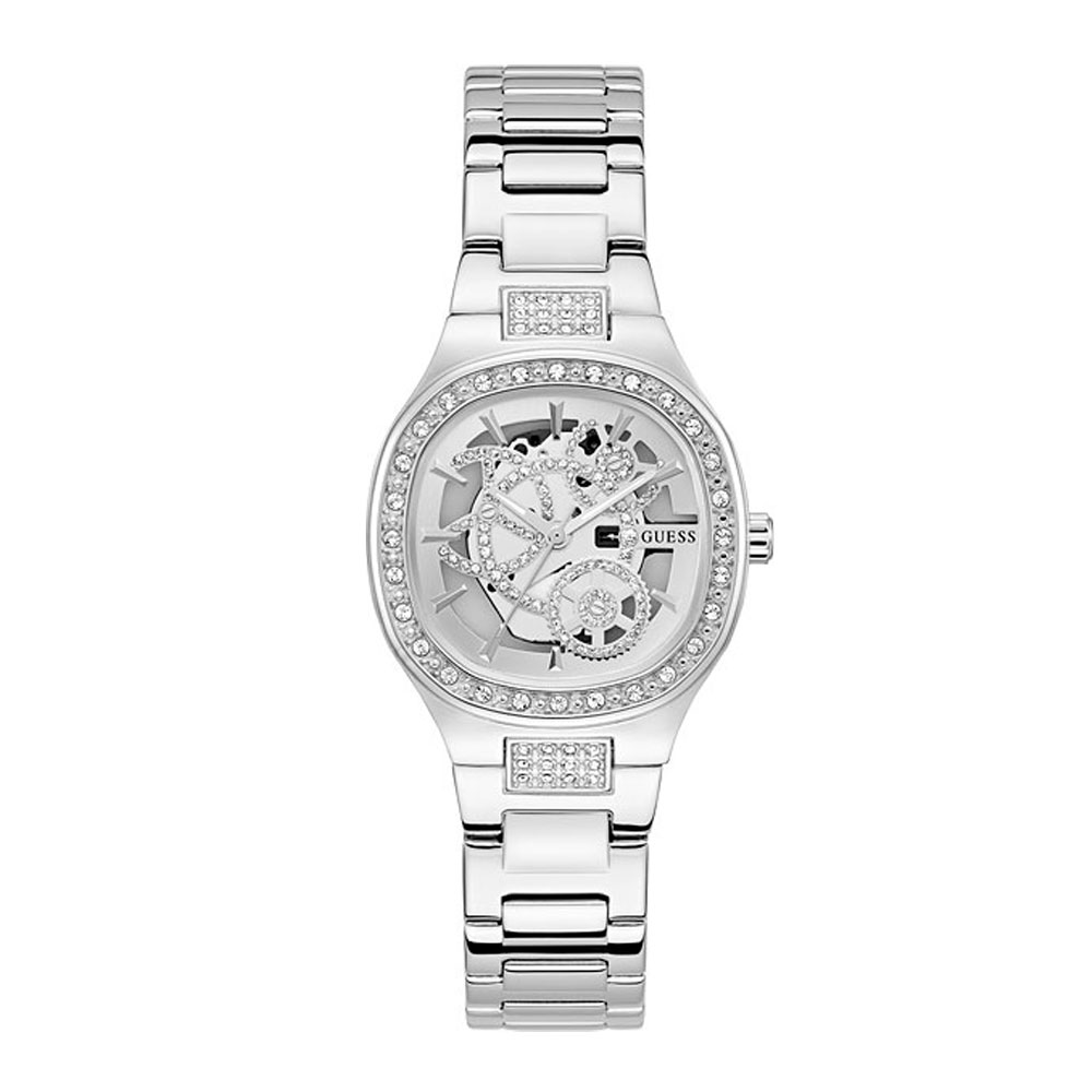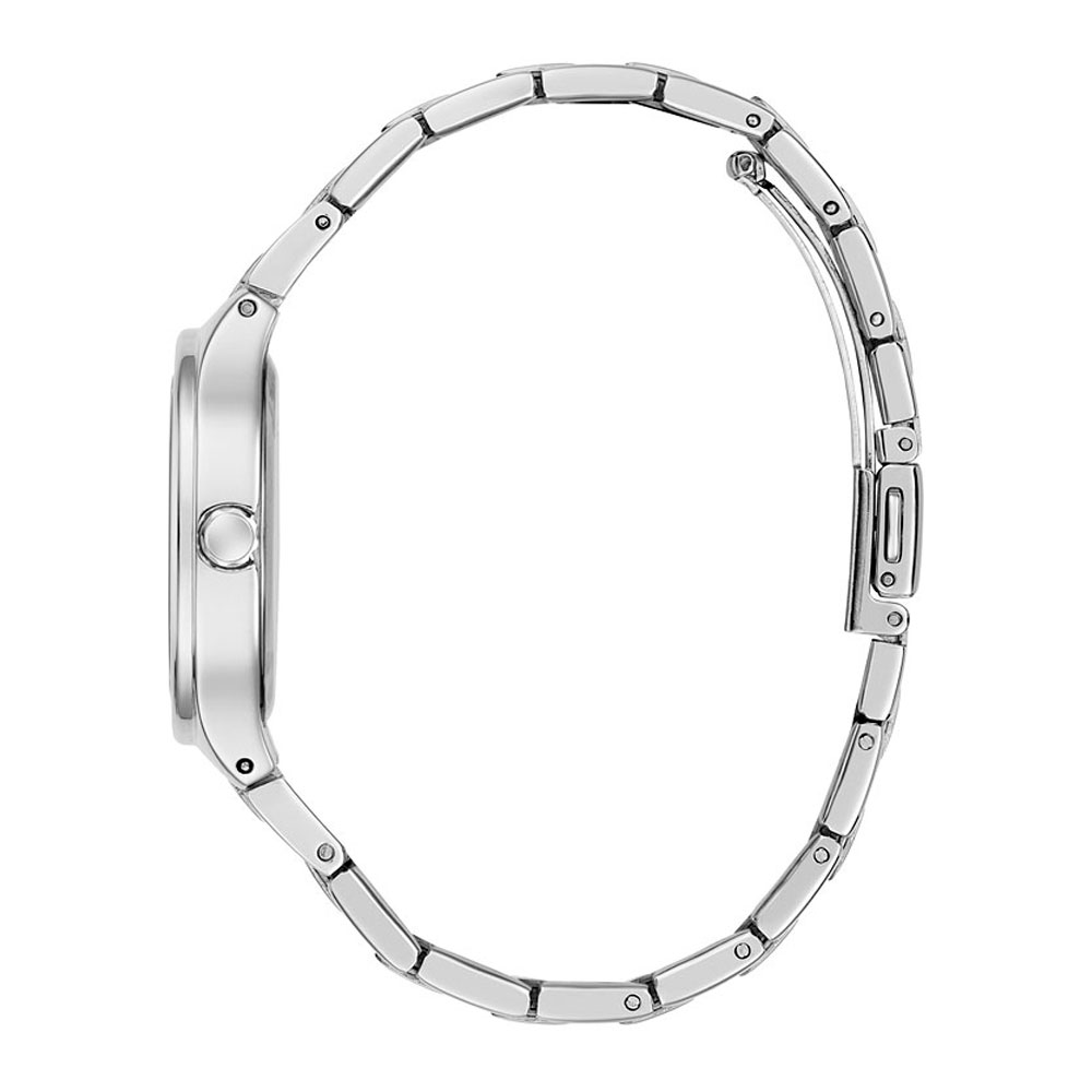 Хотите добавить изюминку в свой образ? Эти стильные часы с квадратным корпусом из серебристого металла (диаметр 32 мм) оснащены хрустальным безелем, эффектным циферблатом с прорезями и элегантным браслетом из нержавеющей стали с хрустальными вставками. Они идеально подходят для тех, кто ценит смелость, современность и надежность. Часы водонепроницаемы до 30 метров.