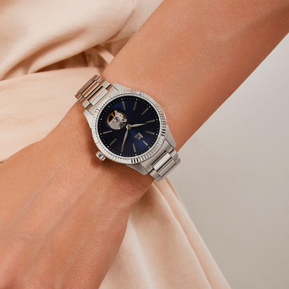 Эти часы сочетают в себе лаконичный повседневный дизайн и изысканные детали. Их циферблаты, выполненные в технике sunray, переливаются богатыми оттенками, а «открытое сердце» на фоне строгих продолговатых индексов притягивает взгляд. Корпус 34 мм из нержавеющей стали 316L с сатинированной отделкой эффектно контрастирует с резным глянцевым безелем. Надежное сапфировое стекло защищает циферблат, а прозрачная задняя крышка раскрывает работу точного автоподзаводного механизма Miyota 9029 с запасом хода 42ч. Часы дополнены элегантным стальным браслетом с комбинированной полировкой и удобной застежкой-бабочкой. Водозащита 5 АТМ делает их не только стильными, но и практичными. Идеальный баланс эстетики и функциональности — для тех, кто ценит утонченность в каждой детали.