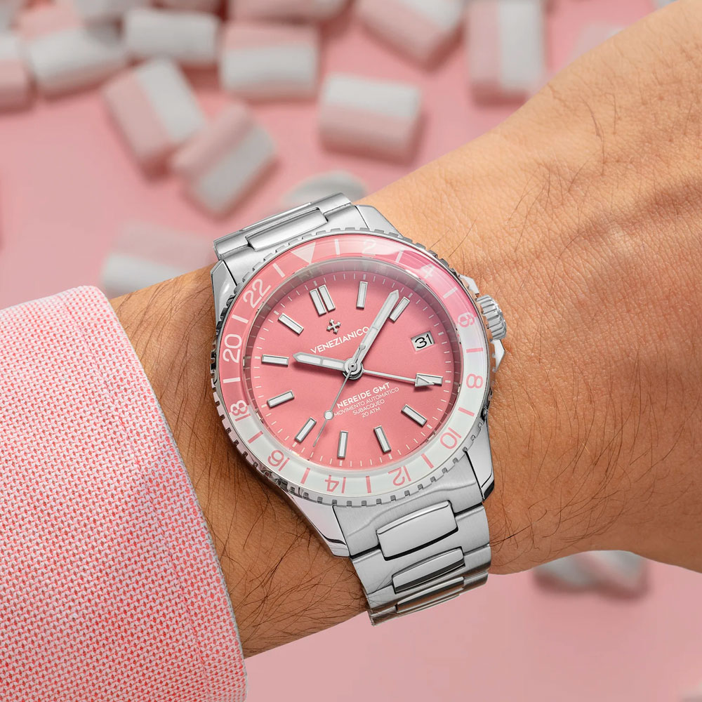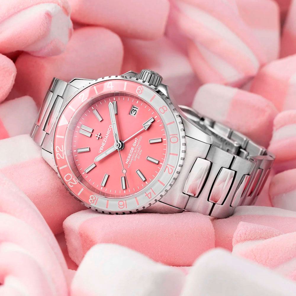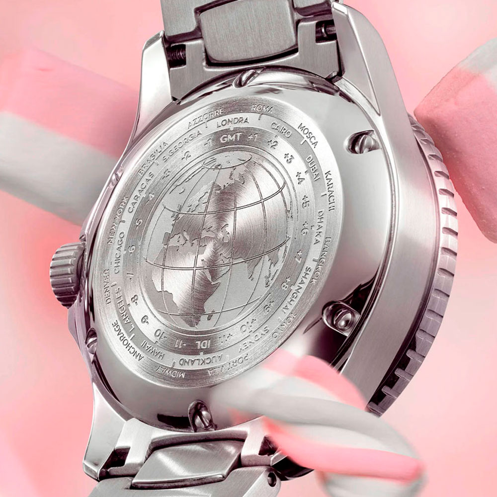 Стильный женский аксессуар с надежным автоматическим механизмом не позволит упустить ни одной важной минуты вашего времени. Женские часы Nereide GMT с круглым корпусом. Часы вдохновлены одним из последних чудес венецианской военно-морской техники — подводной лодкой Nereide. Вращающийся безель. Функция GMT. В механизме 24 камня, частота 21600 полуколебаний в час. Запас хода 41 час. Возможность ручного завода. Метки в виде штрихов. Окошко даты в положении 3 часа. Задняя крышка крепится на 6-ти винтах и украшена выгравированным изображением глобуса. Индивидуальный серийный номер. Рифленая заводная головка с защитой. Браслет Canova с раскладывающейся застежкой. Для изготовления данного браслета требуется 16 различных форм.