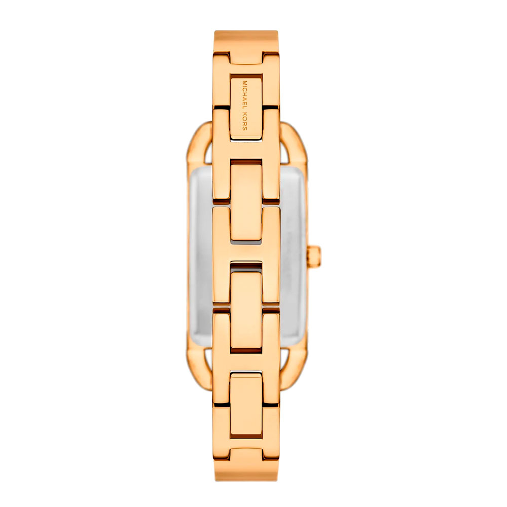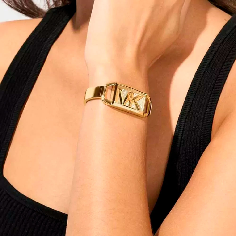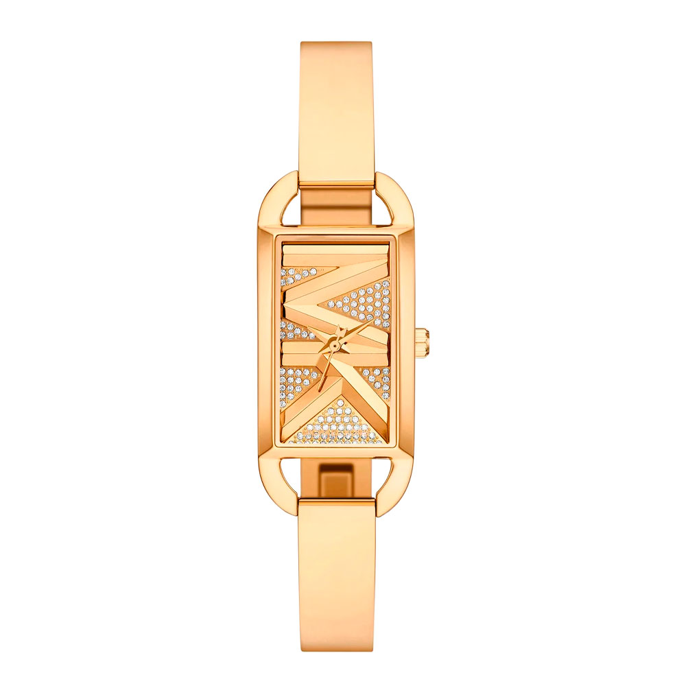 Эти дизайнерские часы — настоящее произведение искусства, которое добавит изысканности и элегантности в любой женский образ. Женские часы MK Empire. Прямоугольный стальной корпус с PVD покрытием цвета желтого золота. Циферблат без меток с логотипом бренда MK декорирован паве из кристаллов и защищен минеральным стеклом. Клиновидные стрелки в стиле Dauphine. Рифленая заводная головка. Стальной браслет с PVD покрытием цвета желтого золота и ювелирной застежкой.