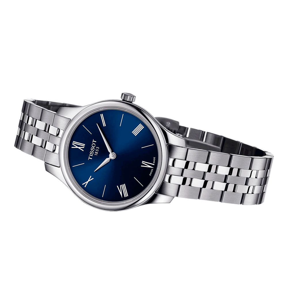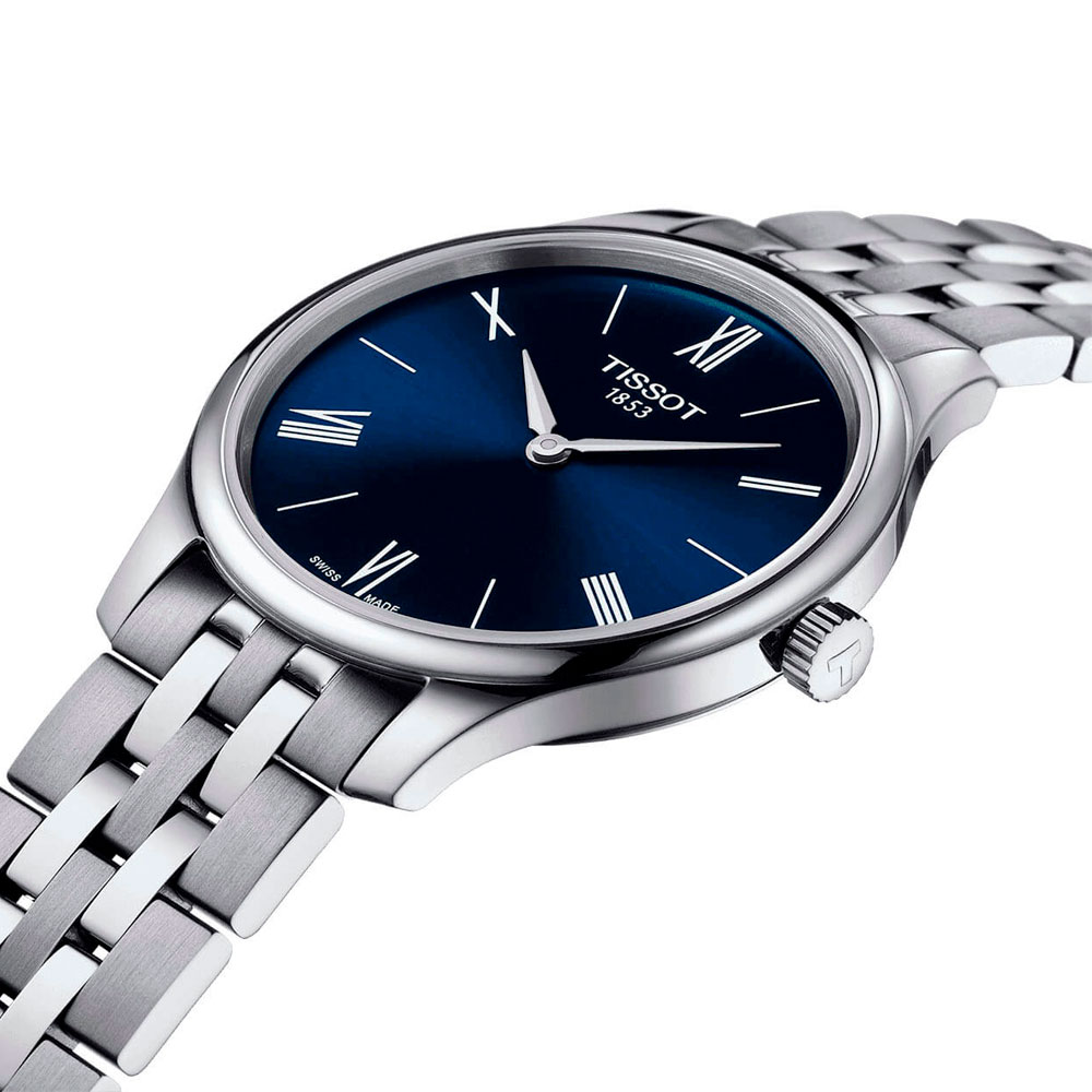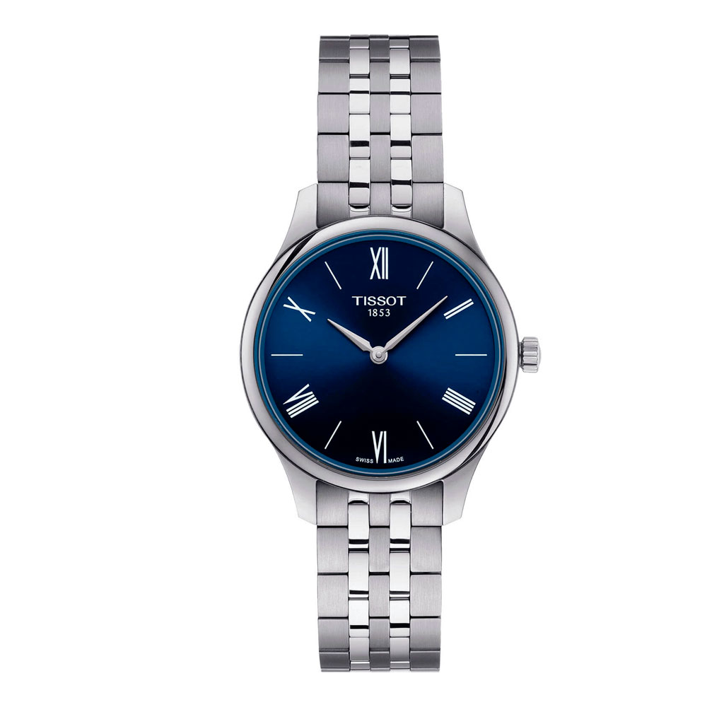 Синий циферблат, дополненный винтажными римскими цифрами, идеально смотрится в сочетании с серебристым отливом корпуса (самый тонкий из всех аксессуаров Tissot - толщина 5,5 мм) из нержавеющей стали 316L. Лаконичное оформление. Кварцевый высокоточный механизм ETA E61.031. Сапфировое стекло невозможно поцарапать. Водостойкость при давлении 3 бар. . Габариты: 31 x 31 x 5,5 мм.