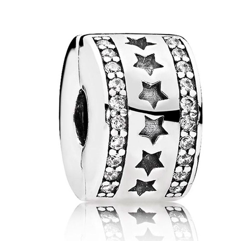 Клипса из серебра 925 пробы украшена резными звездами и кристаллами кубического циркония. Она станет идеальным дополнение для браслета в звездной тематике.