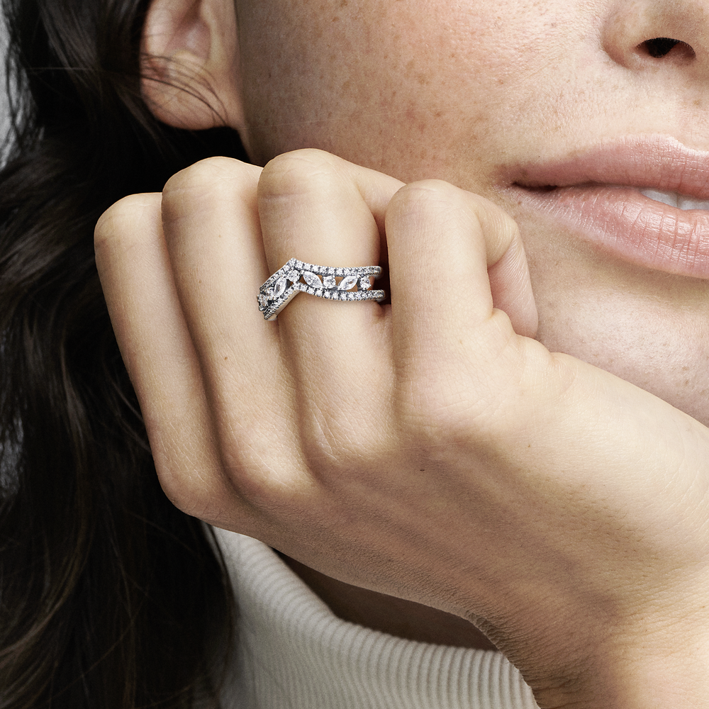 Глядя на древние королевские головные уборы, короны и тиары, дизайнеры Pandora создали кольцо «Мечта» из серебра 925 пробы. Пусть современные принцессы вдохновятся и добавят в свой образ элемент роскоши. Кольцо-шеврон, декорированное рядами сверкающего кубического циркония в классической огранке, несомненно, станет главным украшением любого образа.