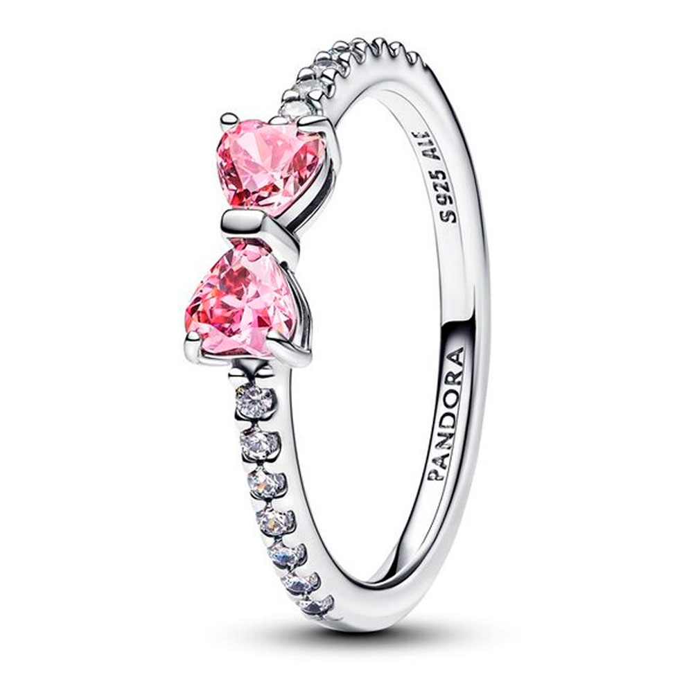 Встречайте кольцо с блестящим розовым бантом: элегантное украшение из серебра 925 пробы. По центру это универсальное кольцо украшено двумя камешками кубического оксида циркония в форме сердца, а изящный бант придает ему блеск и праздничность. Шинка кольца инкрустирована четырнадцатью камешками кубического оксида циркония, придающими дополнительное сияние. Это кольцо будет идеально подходить как к повседневному, так и к официальному наряду, добавляя нотку цвета к любому образу.
