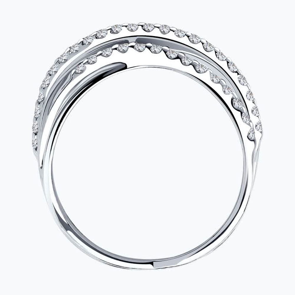 Поклонники тренда на многослойность оценят объёмное кольцо из серебра с фианитами. Дорожки сверкающих вставок подчёркивают особенности формы и придают металлу дополнительную яркость и блеск. Актуальный дизайн, лаконичное декорирование и привлекательная цена не оставят равнодушной ни одну модницу.