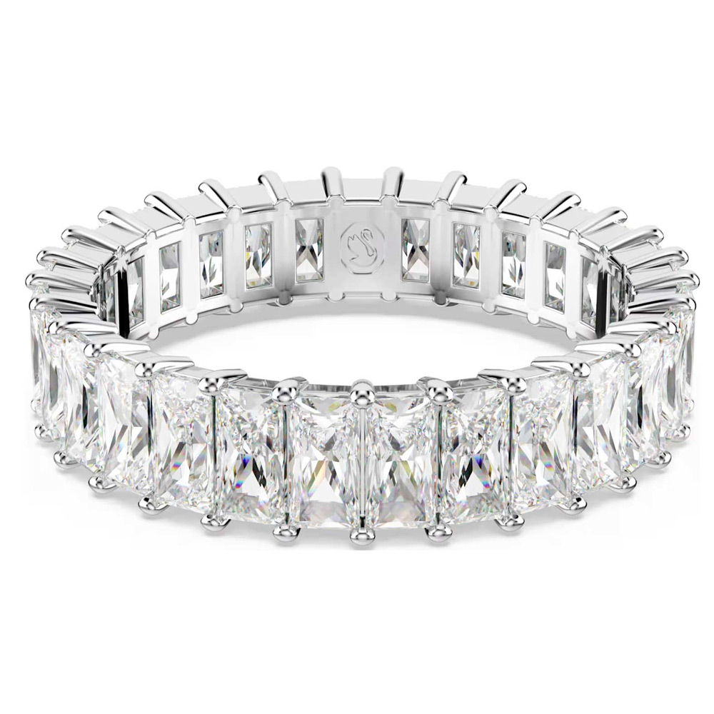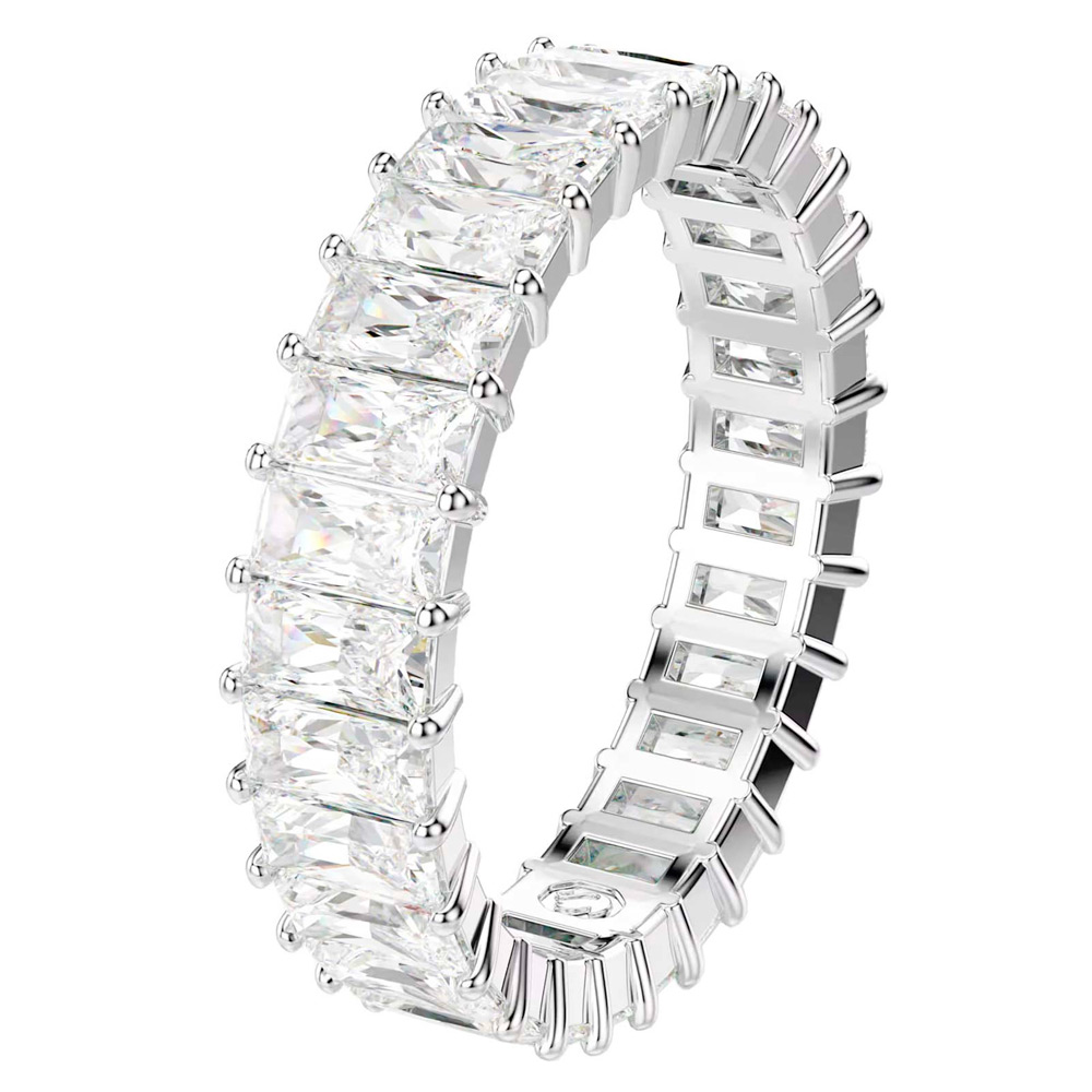 Классическое кольцо из коллекции Matrix в оправе с родиевым покрытием, декорированное дорожкой из прозрачных кристаллов багетной огранки, элегантно дополнит ваш стиль и позволит создать множество комбинаций для разных случаев.