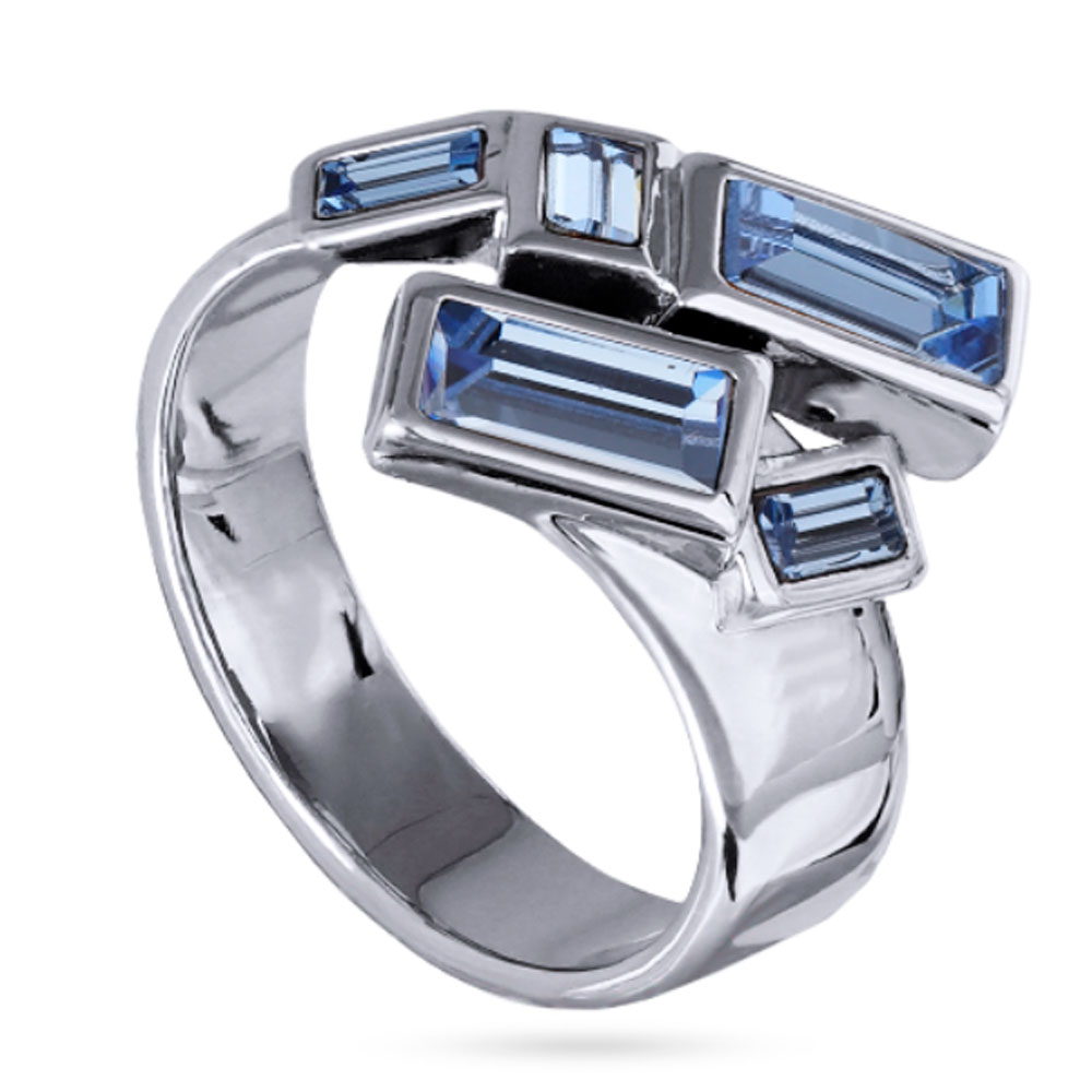 Описание: Изготовлено из ювелирного сплава на основе латуни с гальваническим покрытием родием. Изделие украшают кристаллы SW цвета светлый сапфир. Ширина кольца 2см.