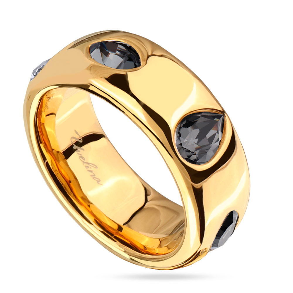 Описание: Изготовлено из ювелирного сплава на основе латуни с гальваническим покрытием золотом. Изделие украшают кристаллы SW темно-серого цвета. Ширина 0.8см.