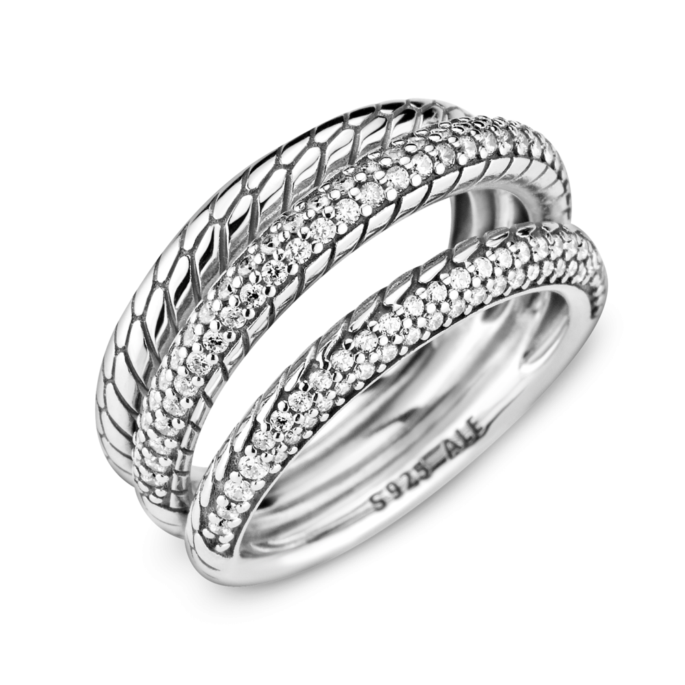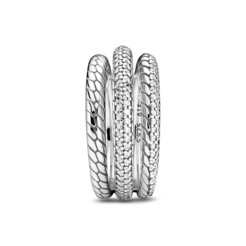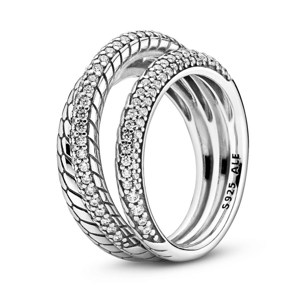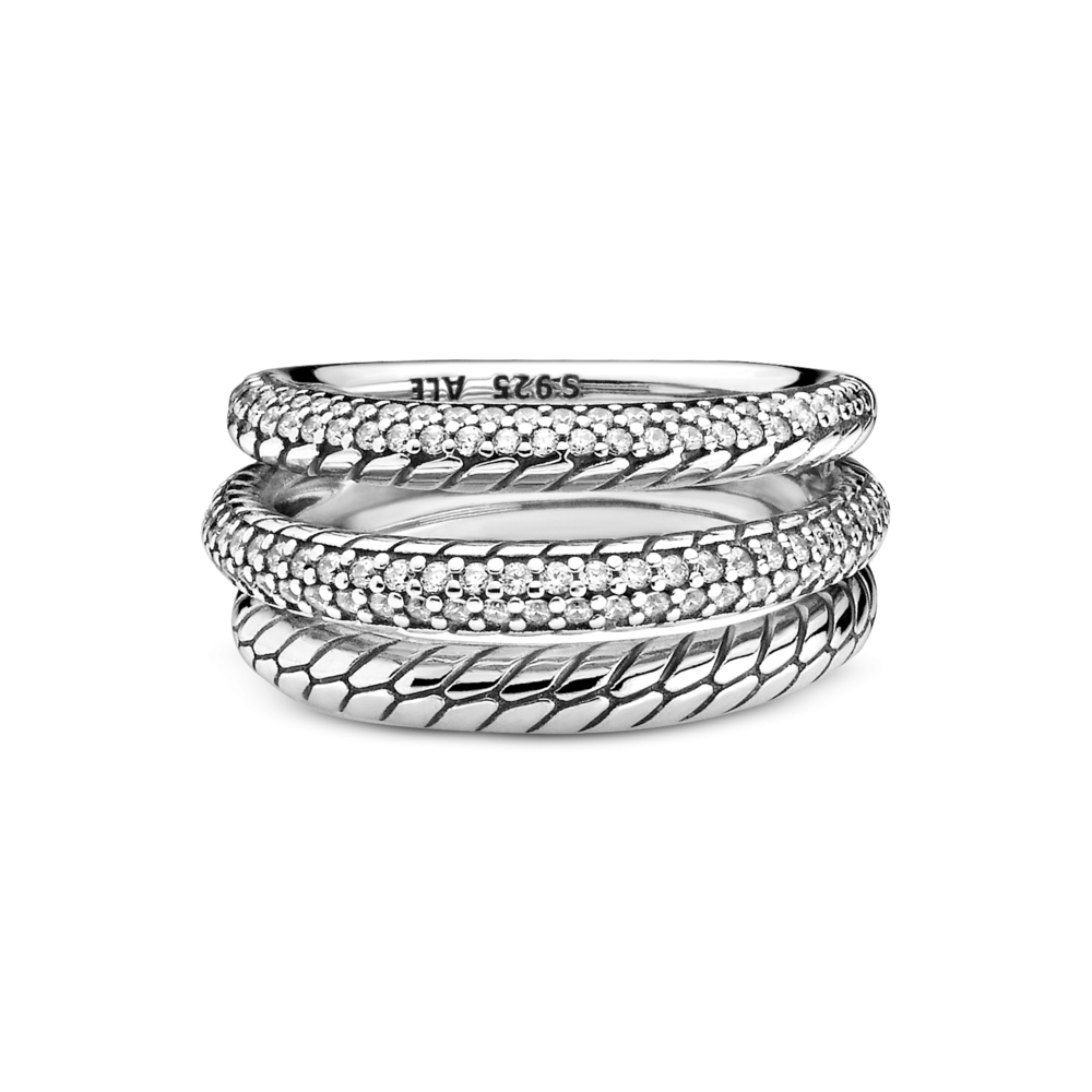 Тройное кольцо оригинального дизайна, вдохновленного плетением классического браслета Pandora Moments. Эффект трех переплетенных колец разных фактур -змеиная кожа, инкрустация камнями кубического циркония в технике паве и иллюзия плетения мягкого браслета Moments. Pandora рассказывает истории через стиль в течение 20 лет. Юбилейная коллекция