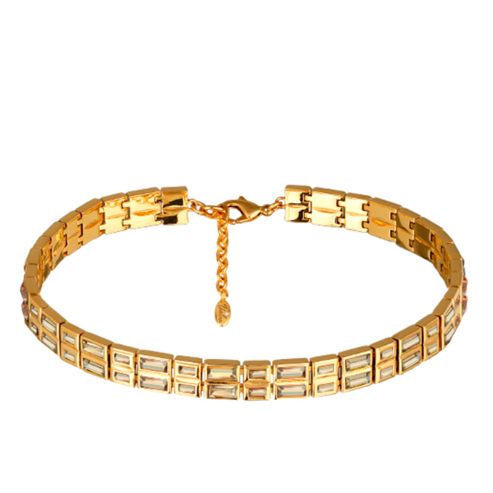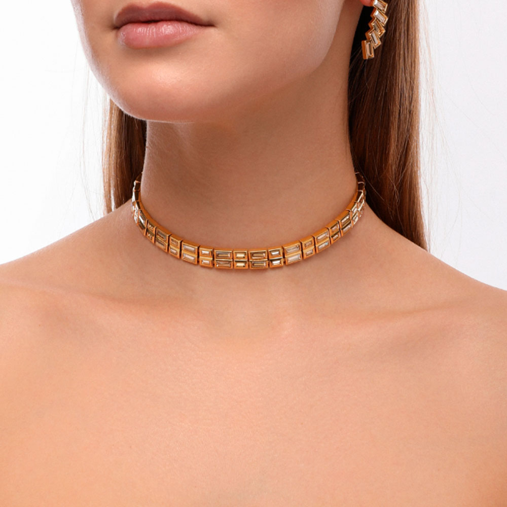 Описание: Изготовлено из ювелирного сплава на основе латуни с гальваническим покрытием золотом. Изделие украшают кристаллы SW шампань цвета. Длина 34-39см. Ширина 1см.