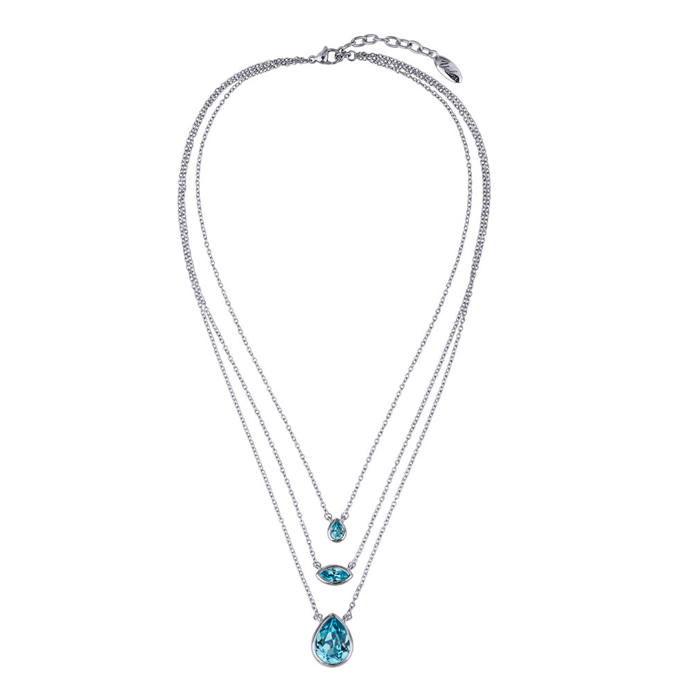 Описание: Изготовлено из ювелирного сплава на основе латуни с гальваническим покрытием родием. Изделие украшают кристаллы SW цвета аквамарин. Длина колье 47см.