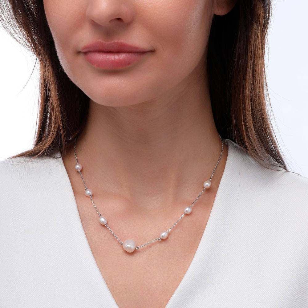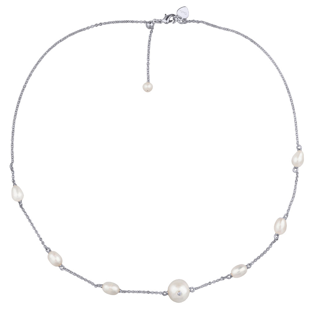 Описание: Изготовлено из ювелирного сплава на основе латуни с гальваническим покрытием родием. Изделие украшают жемчуг и белый фианит Длина 36см. Замок-карабин с удлинителем 5см.