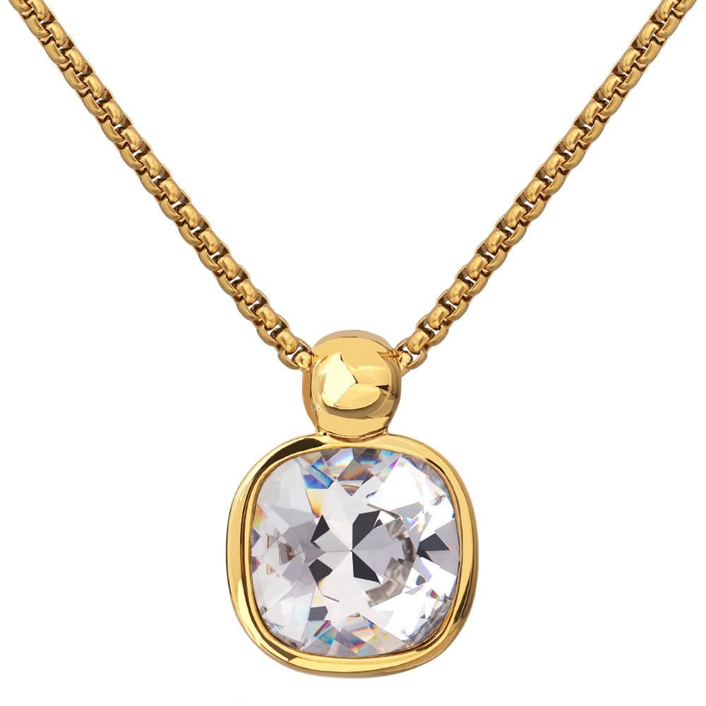 Описание: Изготовлено из ювелирного сплава на основе латуни с гальваническим покрытием золотом. Изделие украшают кристаллы SW белого цвета диаметром 12мм. Длина цепочки 50-55см.