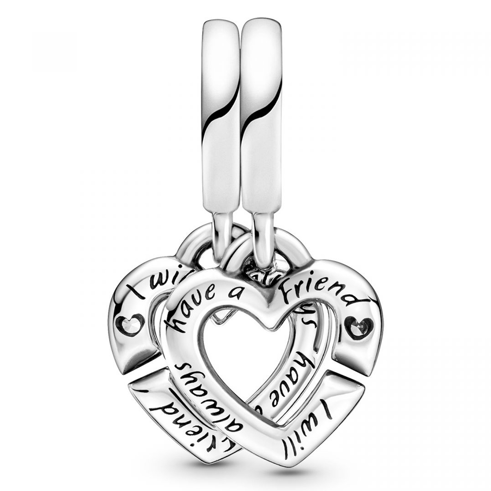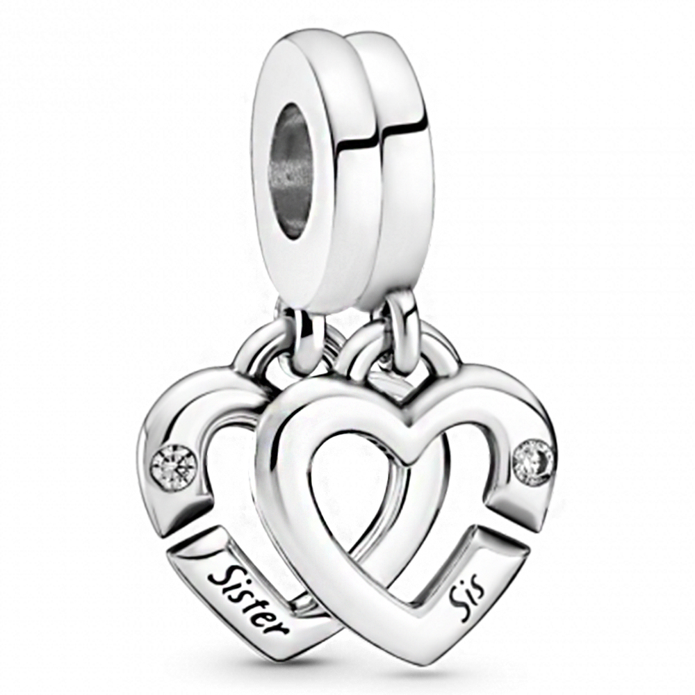 Двойная подвеска из стерлингового серебра позволяет носить ее на одном браслете или разделить с самым близким человеком. Подвески в форме переплетенных сердец украшены прозрачными камнями кубического циркония. Гравировки на подвесках: «Sis» и «Sister» – «Сестра» и «I will always have a friend» — «У меня всегда будет друг». Идеальный подарок для близких сестер или лучших подруг