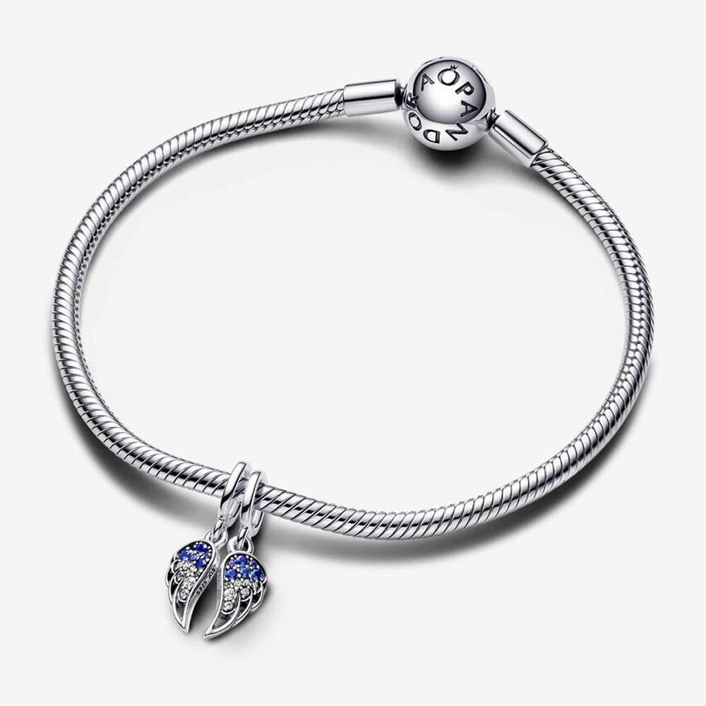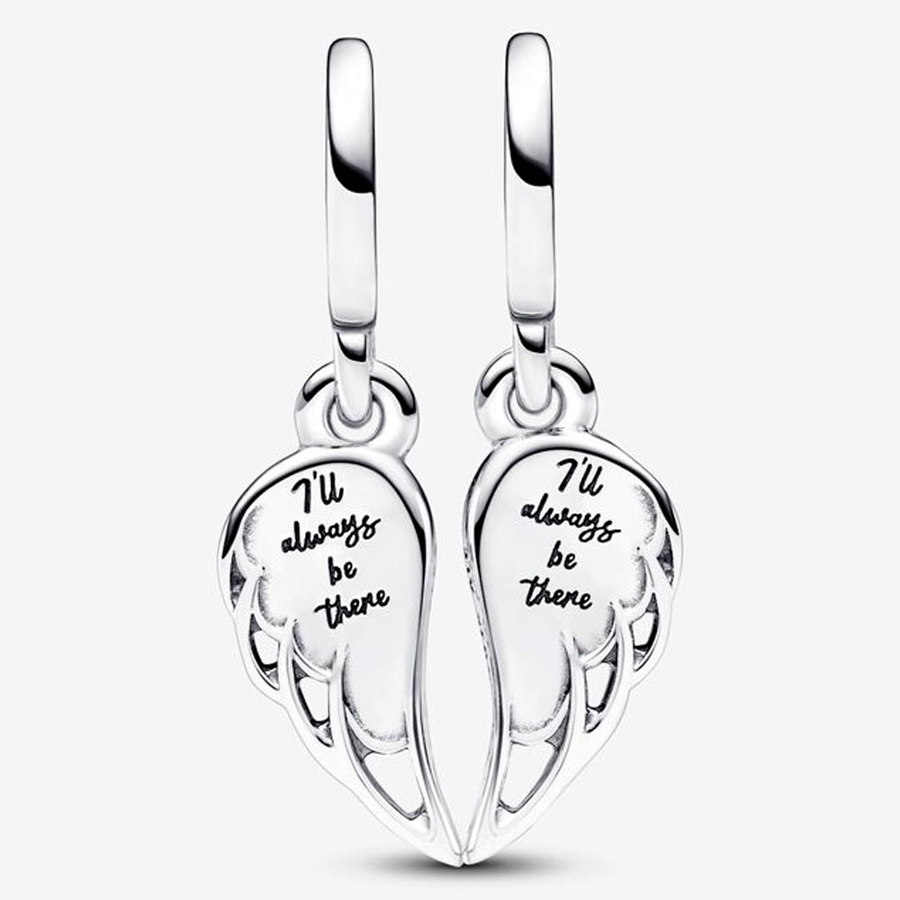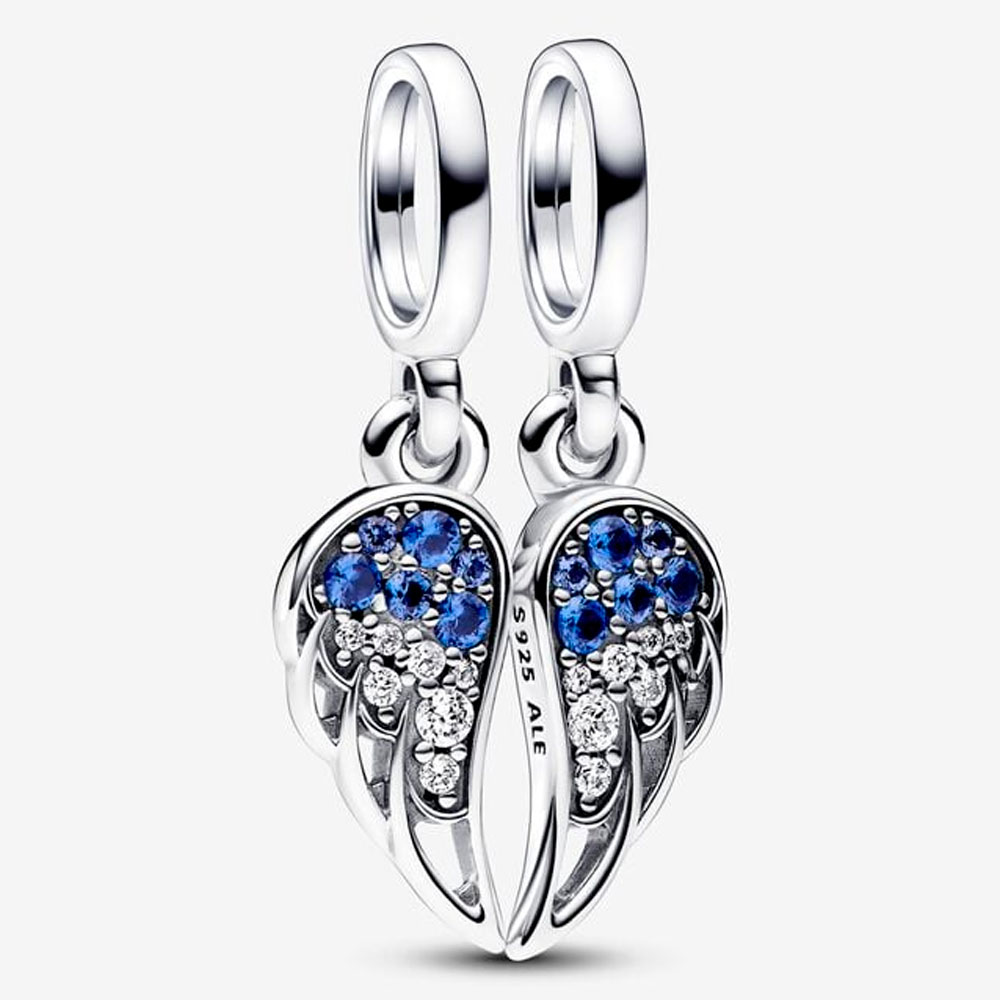 Этот шарм с крыльями ангела, украшенный прозрачными фианитами и искусственными кристаллами звездного синего цвета, имеет выгравированную надпись «Я всегда буду рядом» на задней стороне каждого крыла. Один для себя и один для того, кого вы любите.