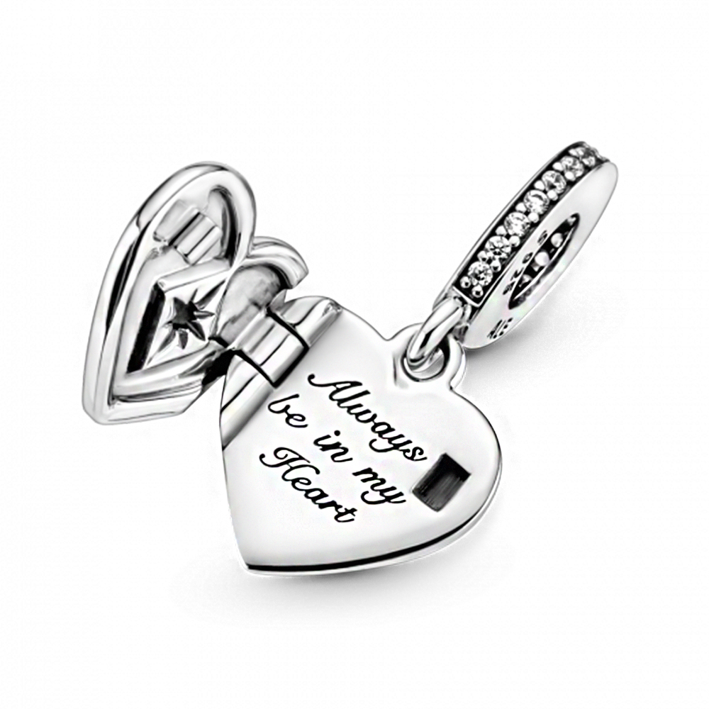 Вдохновленный любовью к друзьям и семье, открывающийся миниатюрный медальон в форме сердца, сделанный из стерлингового серебра. Украшен дорожками кристаллов, в середине подвески — крупный камень кубического циркония бриллиантовой огранки. Гравировка внутри: Always be in my heart — Всегда в моем сердце.