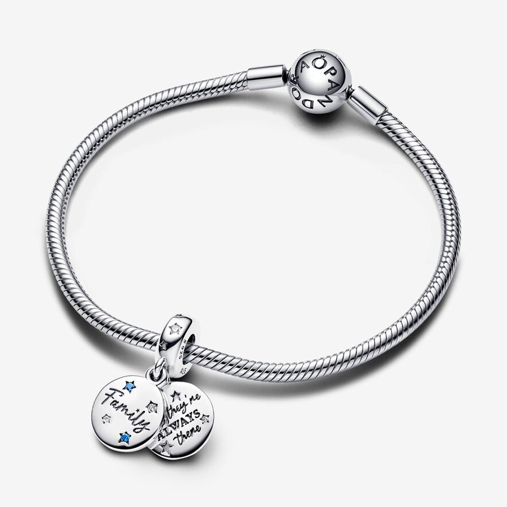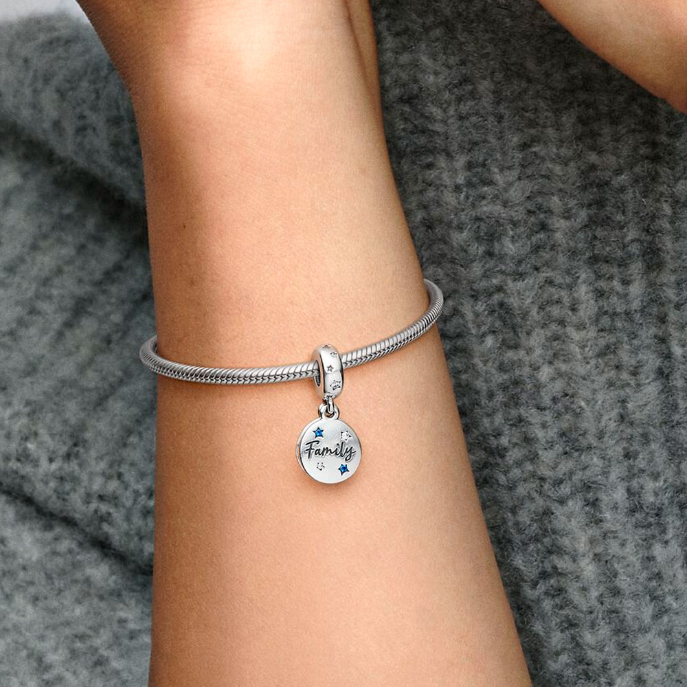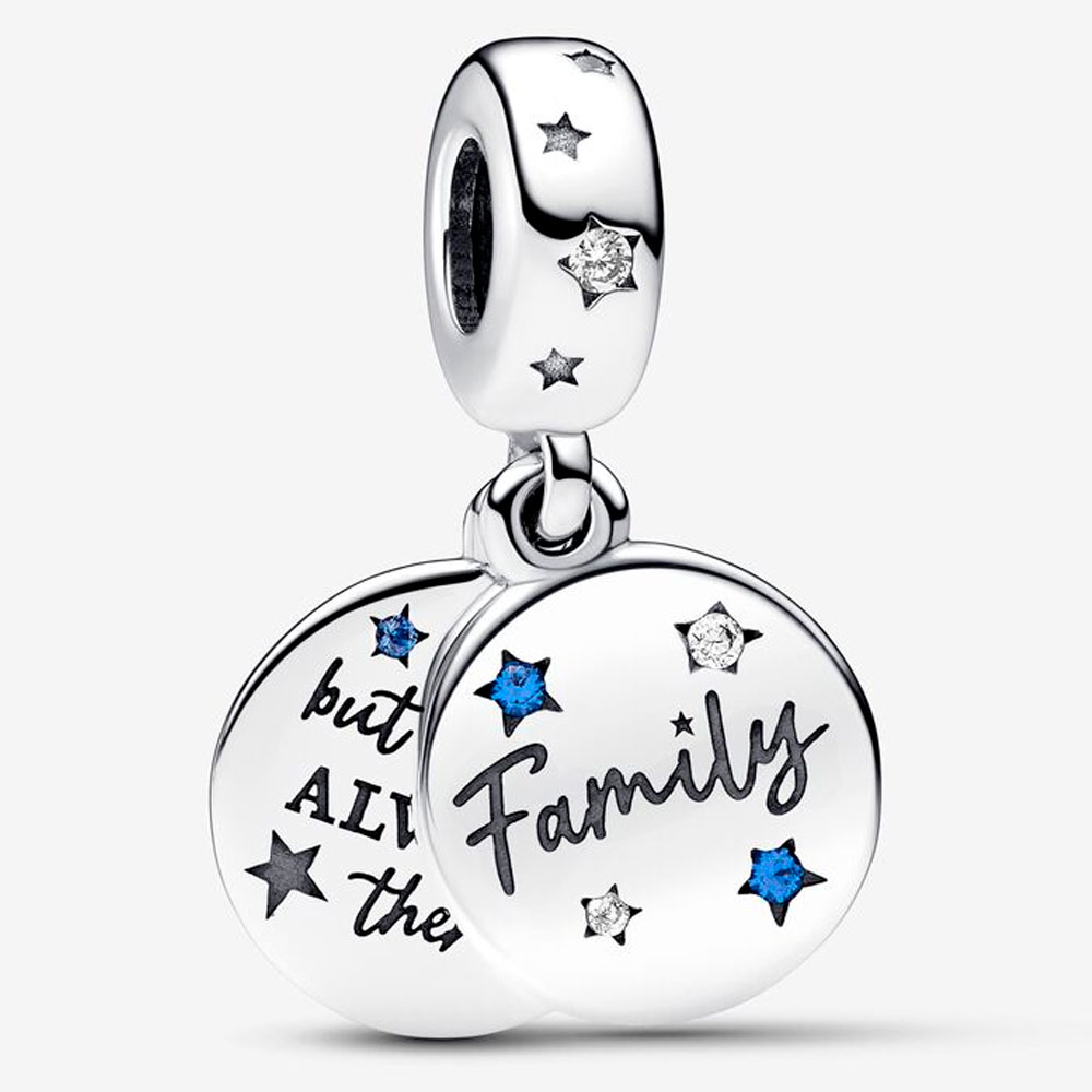 Подвеска с двойными подвесками Family Love предлагает особый способ держать их рядом. Подвеска из стерлингового серебра с двумя дисками, рассказывающими историю посредством гравюр. На поверхности разбросана надпись: «Семья... как ЗВЕЗДЫ, их не всегда видишь... Но они ВСЕГДА рядом». Завершают этот подвесной шарм круглые прозрачные фианиты круглой огранки и синие искусственные кристаллы, мерцающие, как звезды. Носите свою любимую цепочку и всегда напоминайте о тех, кого вы любите больше всего.