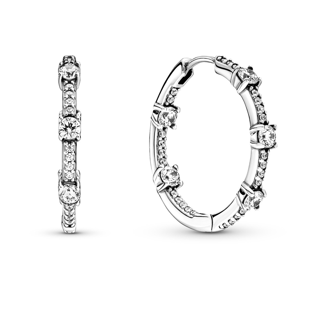 Серьги-кольца из стерлингового серебра с камнями кубического циркония в технике паве. Особенно актуальны в новом сезоне. Переливающиеся камни разной формы создают элегантный образ. Прекрасно сочетаются с новыми теннисными браслетами.