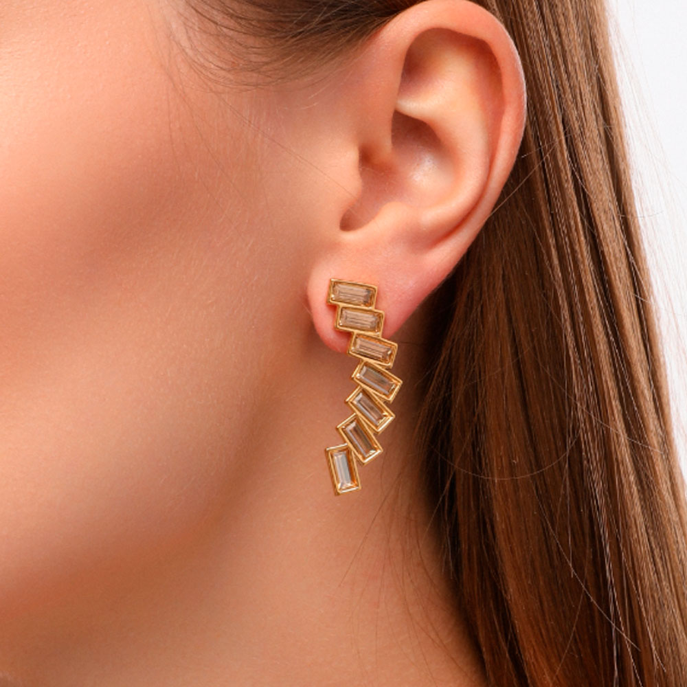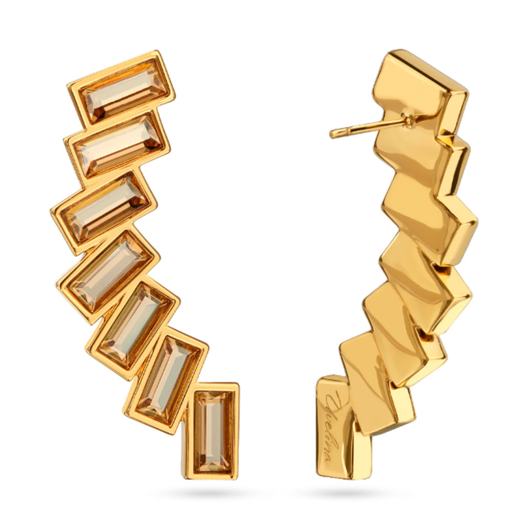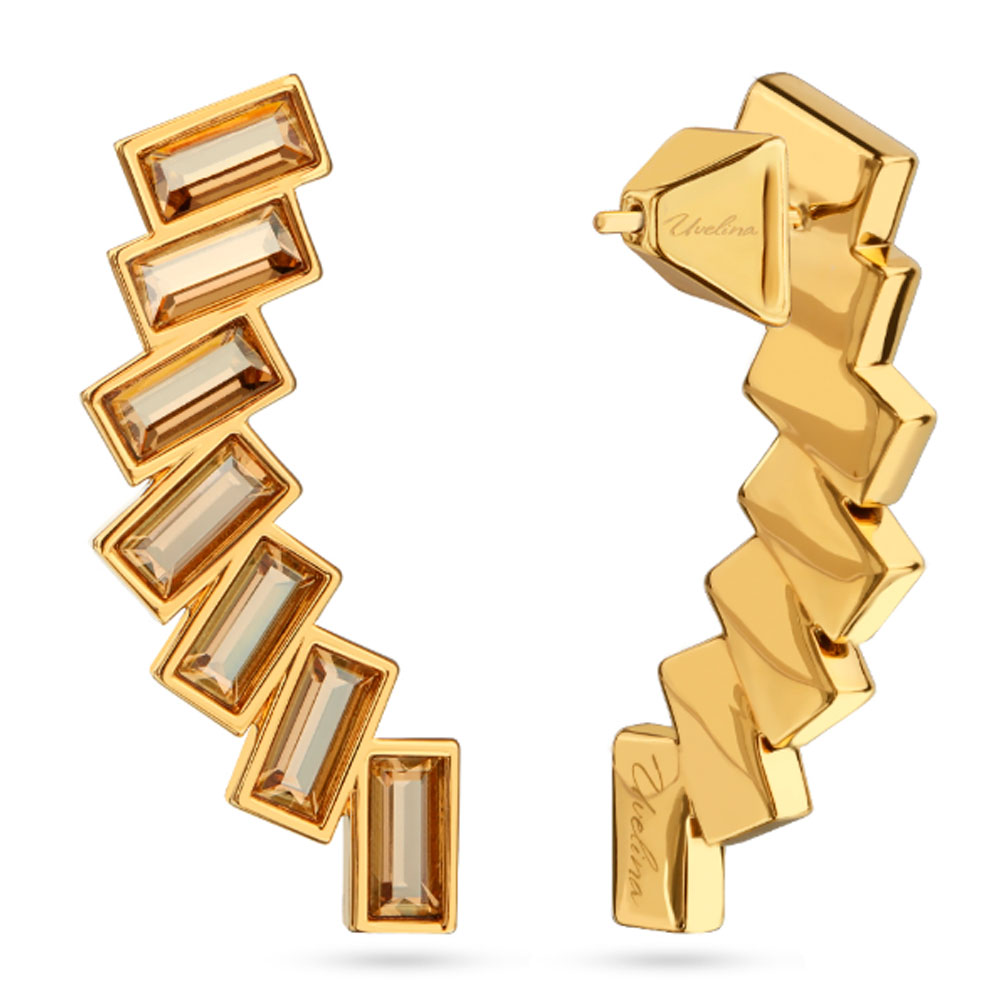 Описание: Изготовлено из ювелирного сплава на основе латуни с гальваническим покрытием золотом. Изделие украшают кристаллы SW цвета шампань. Размер серьги 4х1.5см. Застежка-гвоздики.