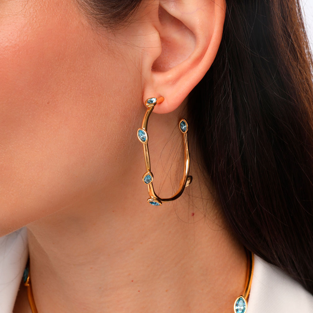 Описание: Изготовлено из ювелирного сплава на основе латуни с гальваническим покрытием золотом. Изделие украшают кристаллы SW цвета аквамарин. Диаметр серьги 5см. Застежка-гвоздики.