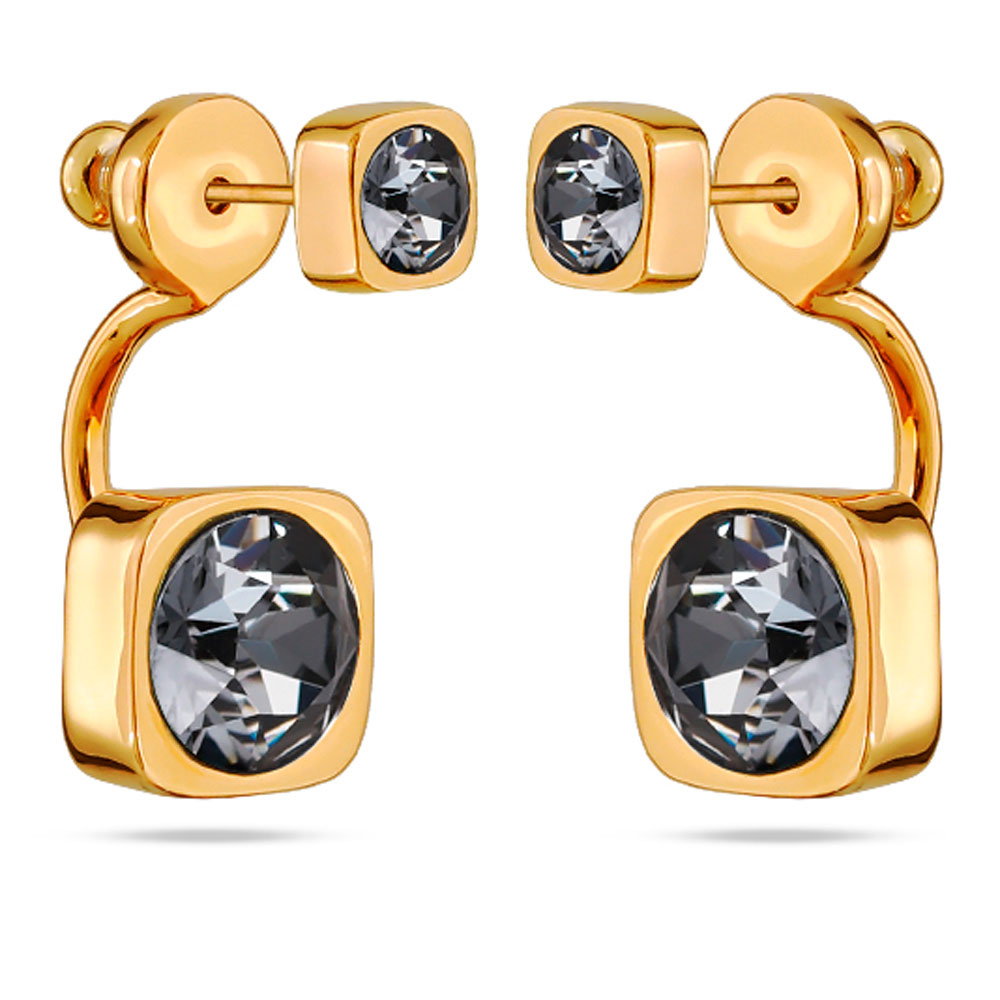 Описание: Изготовлено из ювелирного сплава на основе латуни с гальваническим покрытием золотом. Изделие украшают темно-серые кристаллы SW диаметром 4 и 8мм. Длина серьги 2.3см. Застежка-гвоздики.
