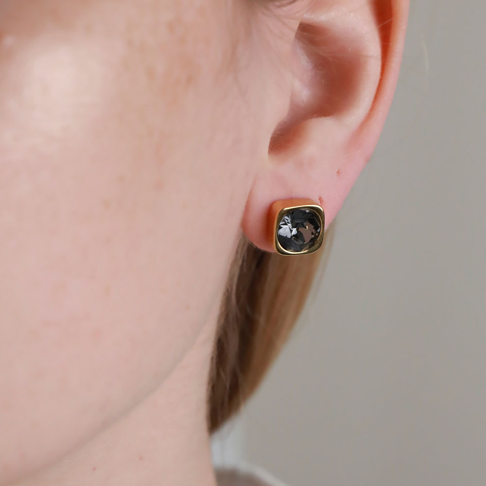 Описание: Изготовлено из ювелирного сплава на основе латуни с гальваническим покрытием золотом. Изделие украшают кристаллы SW темно-серого цвета диаметром 8мм.