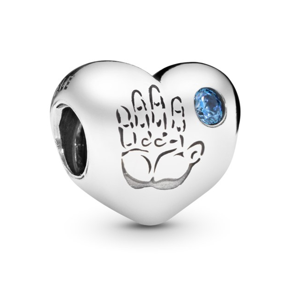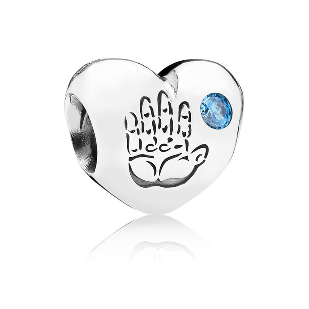 Этот милый шарм - отличный подарок для тех, кто празднует рождение прекрасного мальчика. Изделие имеет форму серебряного сердца, украшенное небольшим выгравированным отпечатком руки и синим кубическим цирконием.