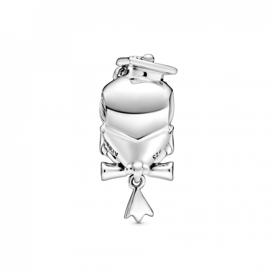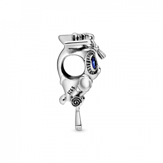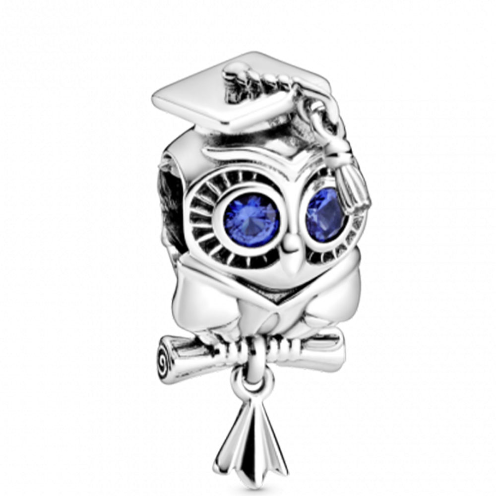 Шарм Moments "Мудрая сова" из серебра 925 пробы Маленькая свободно свисяющая кисточка на шапке выпускника и двигающийся хвост совы. Большие синие выразительные глаза совы инкрустированы камнями. Вдохновение: Окончание школы или университета. Посвящение достижениям и напоминание о возможностях