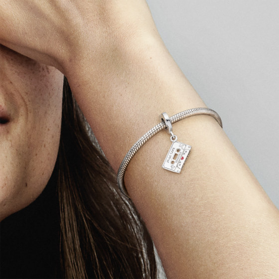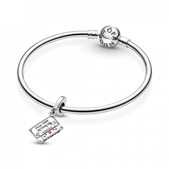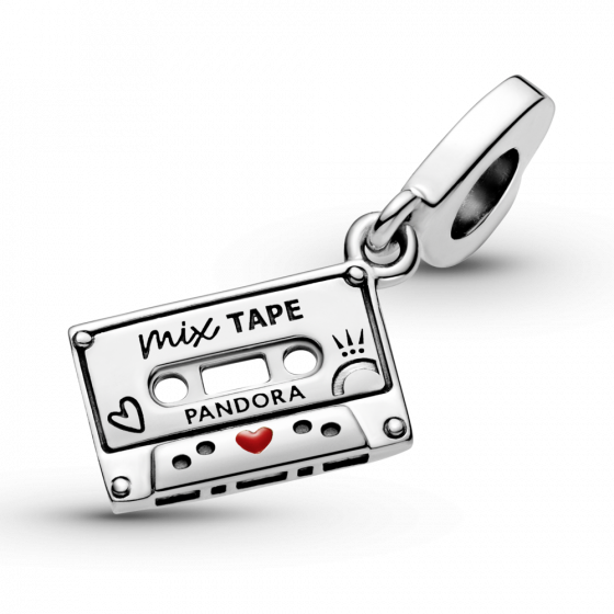Настоящая винтажная аудиокассета в шарме-подвеске Moments «Аудиокассета» из серебра 925 пробы с эмалью. На подвеске маленькое красное эмалевое сердечко, корона O и гравировки: “Our love songs” — «Наши песни о любви» и “Mix tape" — «Плейлист»