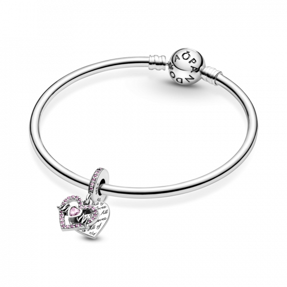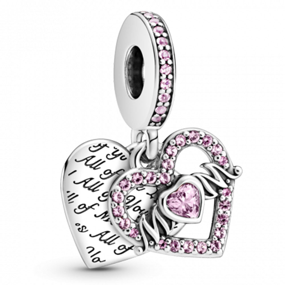 Двойной шарм-подвеска Moments "Мамочка" из серебра 925 пробы с камнями кубического циркония и розовыми кристалами в технике паве. В центре подвески надпись “Mum” (Мама), на второй подвеске насена гравировка “All of Me Loves all of You” (Люблю тебя каждой клеточкой).
