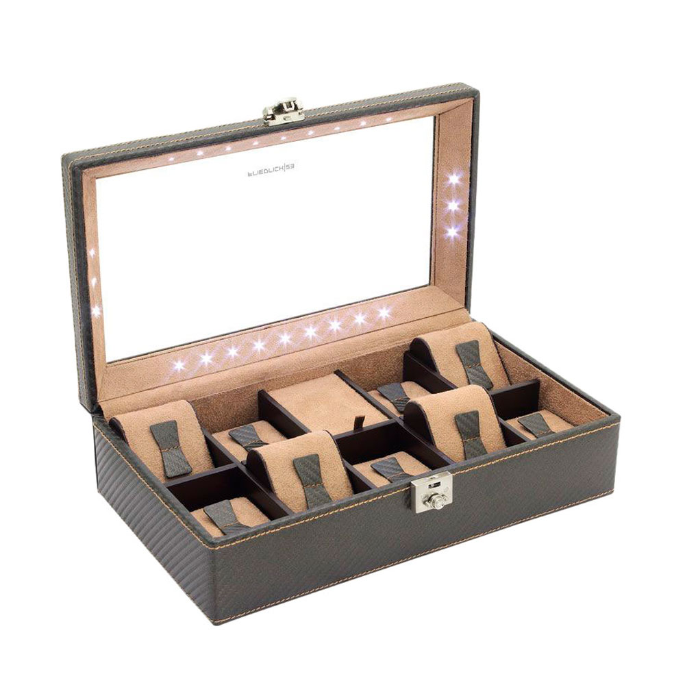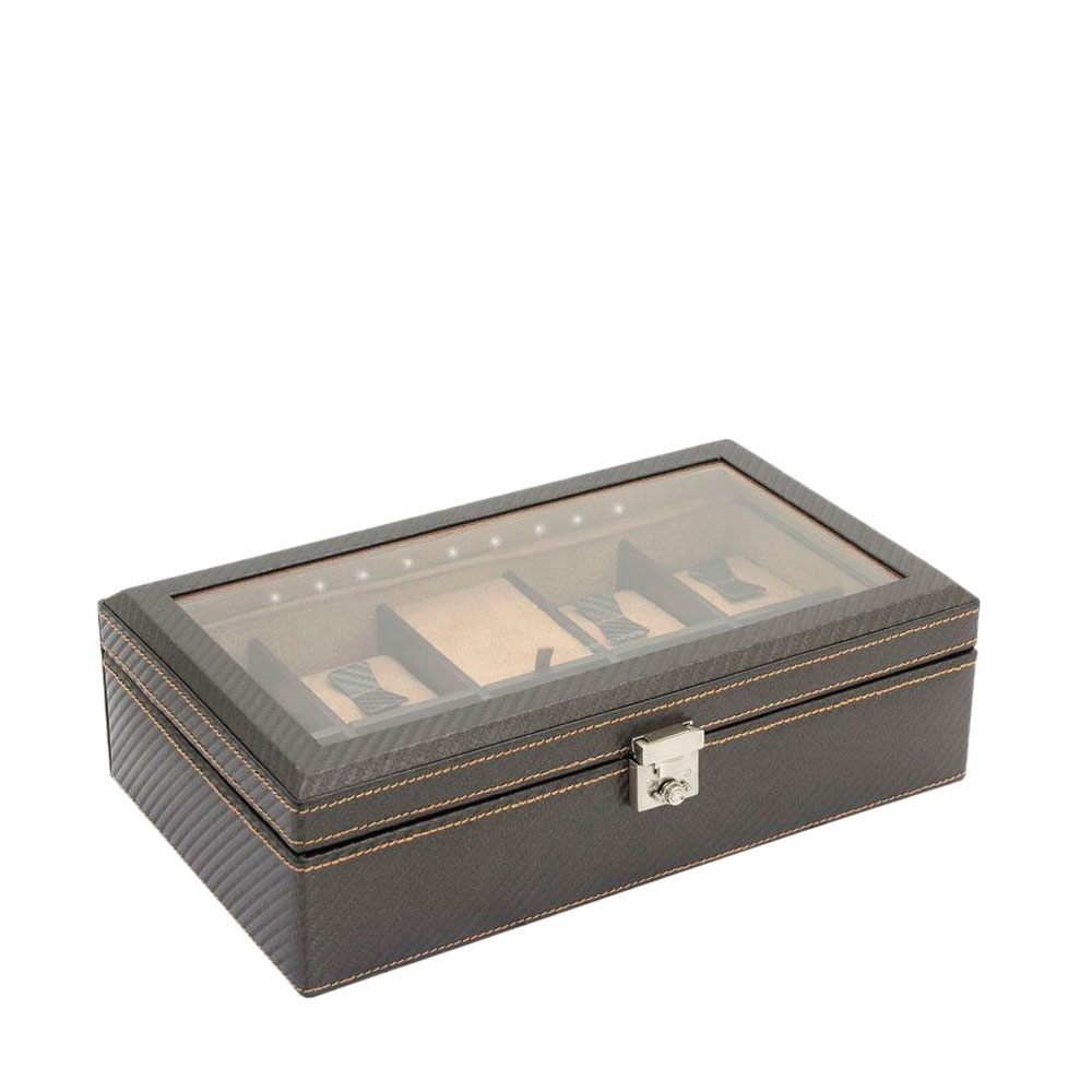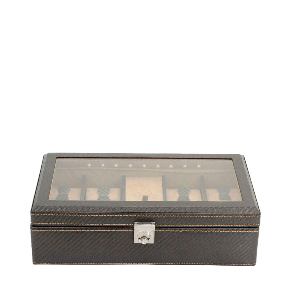 Carbon. Футляр для хранения 9 часов из искусственной кожи текстурированной под карбон. Крышка оснащена смотровым окошком со стеклом и внутри подсвечивается светодиодными лампочками. Футляр надежно закрывается на ключ.
