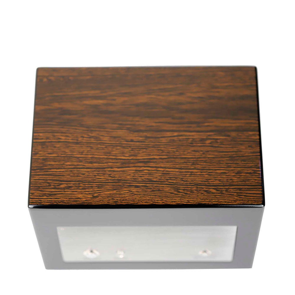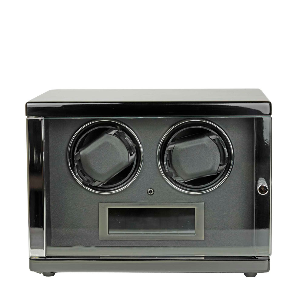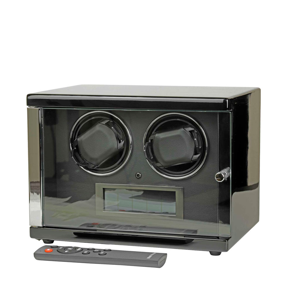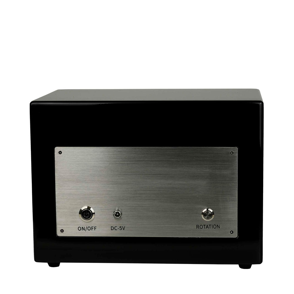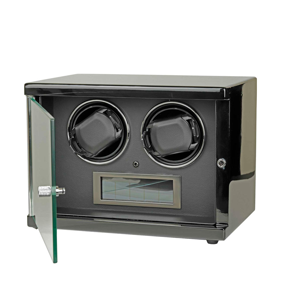 Шкатулка для 2 часов с автоподзаводом. Режимы вращения: по/против часовой стрелки и двунаправленные режимы, скорость вращения от 650 до 2200 оборотов в сутки. Темная внутренняя отделка. Пульт дистанционного управления. Светодиодная подсветка. Прозрачная крышка из закаленного стекла. Бесшумный мотор Mabuchi.