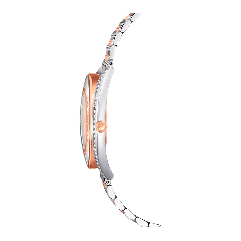 Потрясающие швейцарские часы позволят вам блистать и излучать элегантность в любой ситуации. Женские кварцевые часы Crystalline Aura. Стальной корпус овальной формы с частичным PVD покрытием оттенка розового золота украшен кристальным паве. Циферблат с логотипом Swarovski в виде лебедя в положении 12 часов и метками в виде штрихов выполнен по технологии Sunray (солнечные лучи) и усыпан кристаллами Swarovski. Секундная стрелка отсутствует. Рифленая заводная головка. Стальной браслет с частичным PVD покрытием оттенка розового золота и застежкой-бабочкой.