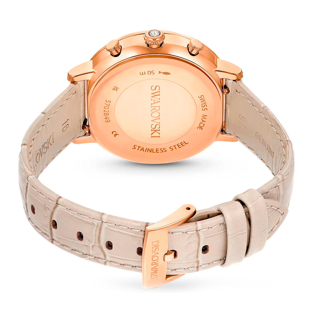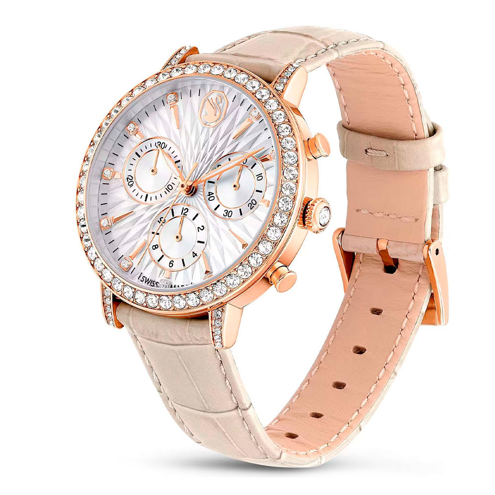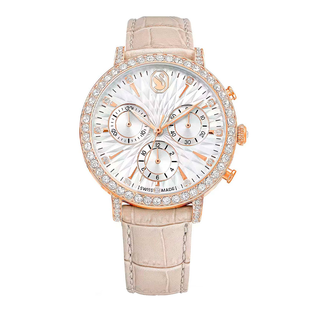 Женские часы-хронограф с секундомером Matrix Tennis Chrono. Стальной круглый корпус с PVD покрытием оттенка розового золота. Безель декорирован паве из 48 сверкающих кристаллов Swarovski. Под минеральным стеклом открывается завораживающий гильошированный циферблат с логотипом Swarovski в виде лебедя в положении 12 часов и метками в виде штрихов, дополненных точками, инкрустированными кристаллами круглой огранки, придающими циферблату особое очарование и блеск. Три счетчика хронографа предназначены для отдельного измерения часов, минут и секунд. Рифленая заводная головка украшена сверкающим кристаллом круглой огранки. Ремешок из натуральной итальянской телячьей кожи бежевого цвета с тиснением под кожу крокодила. Классическая застежка с логотипом Swarovski.