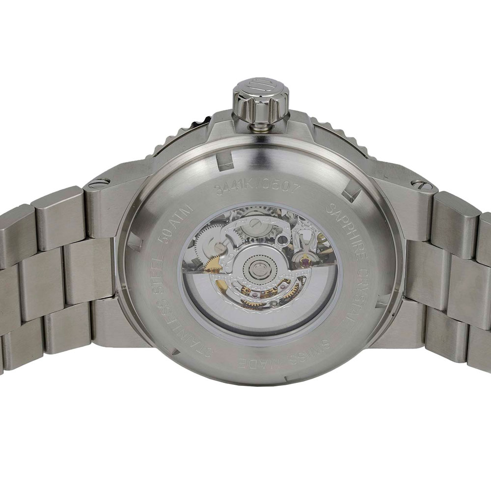 От этих швейцарских часов невозможно оторвать взгляд. Неповторимый по своей красоте скелетон приоткроет дверцы в волшебный мир механизма часов. Насладитесь отлаженным движением механизма. Sportive Diver. Скелетонизированные механические часы в круглом корпусе. В механизме 26 камней, частота 28800 полуколебаний в час. Запас хода 38 часов. Циферблат с метками в виде штрихов. Окошко даты. Открытый диск дат имеет чёрный цвет. Заводная головка с защитой. Прозрачная задняя крышка из минерального стекла. Стальной браслет с раскладывающейся застежкой.