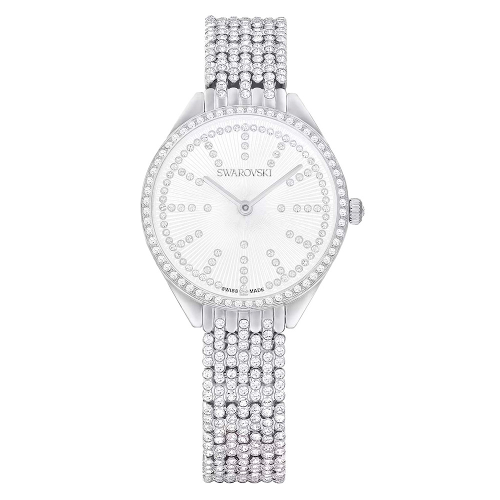 Изысканные дизайнерские часы, сделанные в Швейцарии, станут идеальным дополнением к вашему роскошному повседневному образу. Женские кварцевые часы. Стальной круглый корпус, декорированный кристаллами Swarovski. Серебристый циферблат украшен гильошированным узором и кристаллами для индексных меток. Рифленая заводная головка украшена кристаллом круглой огранки. Стальной браслет с застежкой-бабочкой, декорированный кристаллами Swarovski.