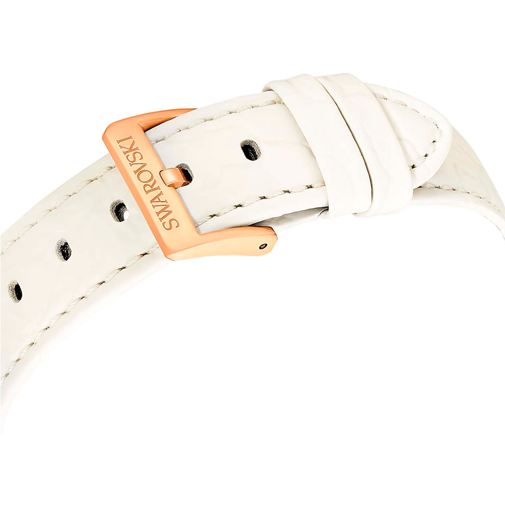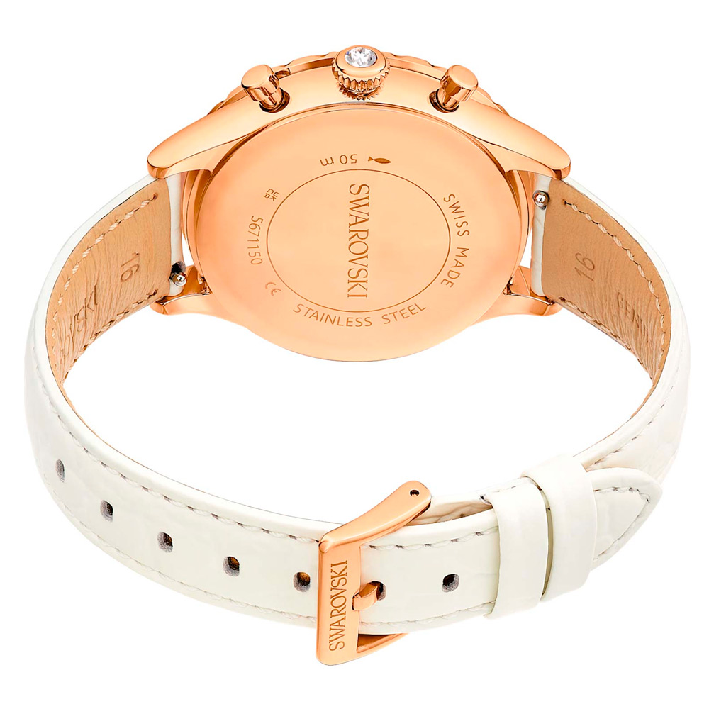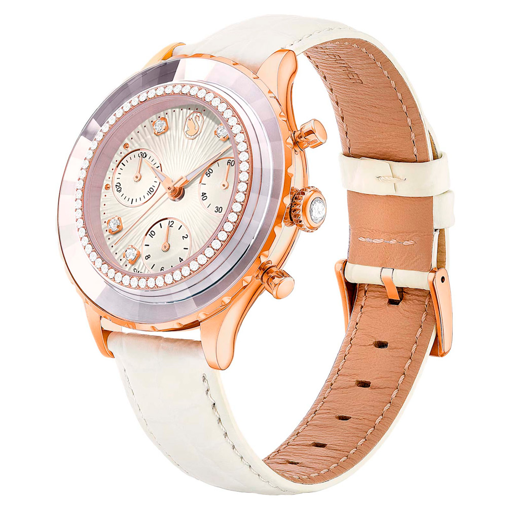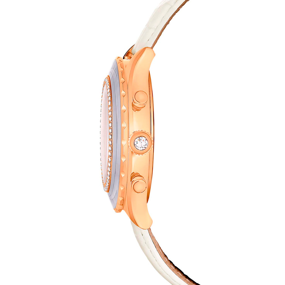 Изысканные и стильные, эти наручные часы созданы специально для современных утонченных представительниц прекрасного пола, ценящих свое время. Женские часы-хронограф с секундомером. Стальной круглый корпус с PVD покрытием оттенка розового золота эффектно сочетается с ограненным кристальным безелем, окруженным сверкающими кристаллами Swarovski. Под минеральным стеклом открывается завораживающий гильошированный циферблат с логотипом Swarovski в виде лебедя в положении 12 часов и метками, представленными точками, шесть из которых оформлены кристаллами круглой огранки, придавая циферблату особое очарование и блеск. Три счетчика хронографа предназначены для отдельного измерения часов, минут и секунд. Стрелки с люминесцентным покрытием LumiNova, которое светится в темноте после непродолжительной зарядки на свету. Рифленая заводная головка украшена сверкающим кристаллом круглой огранки. Ремешок из натуральной итальянской телячьей кожи белого цвета с тиснением под кожу крокодила. Классическая застежка.