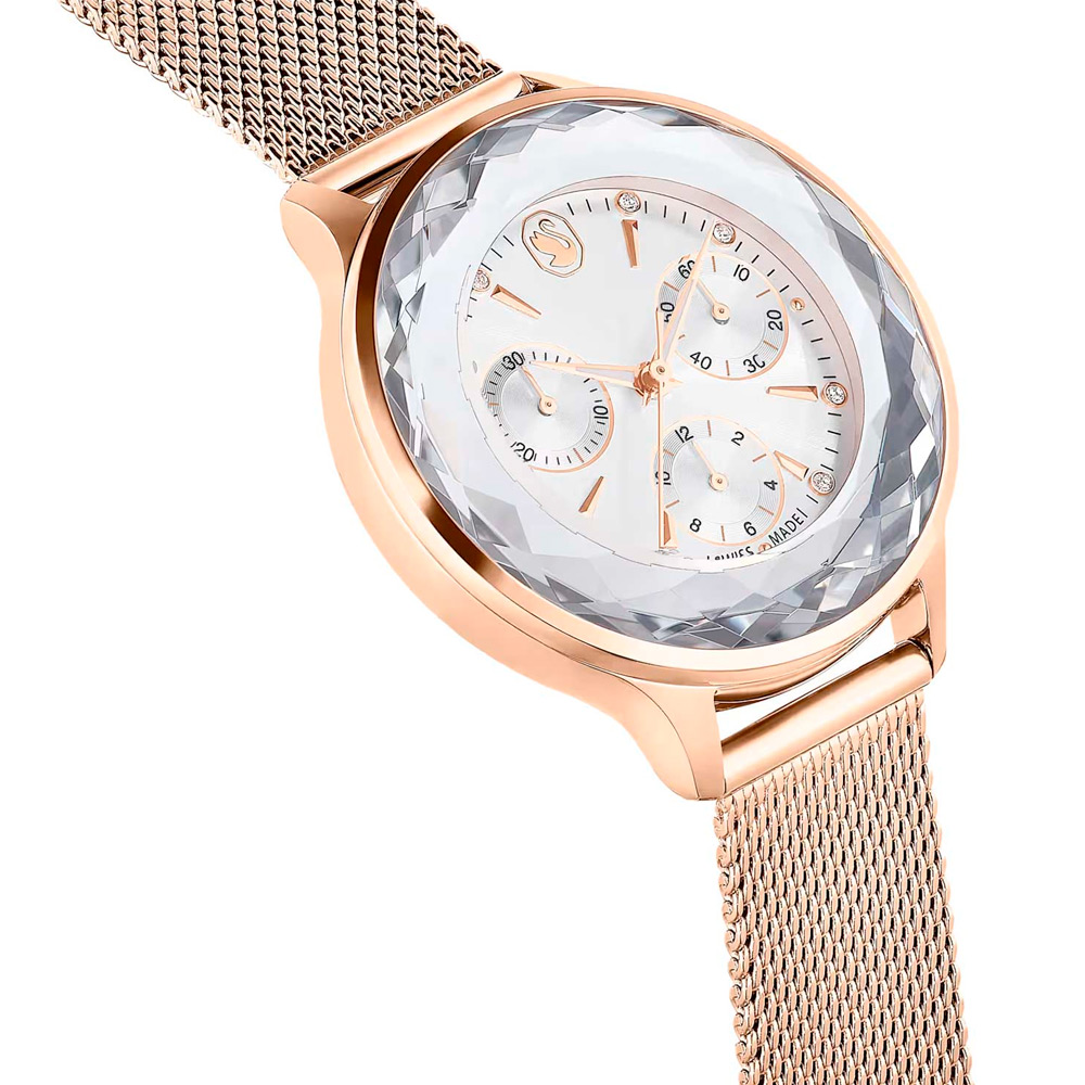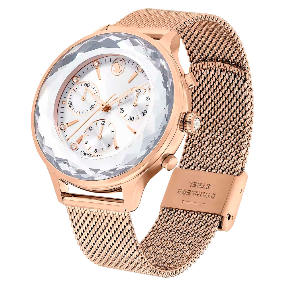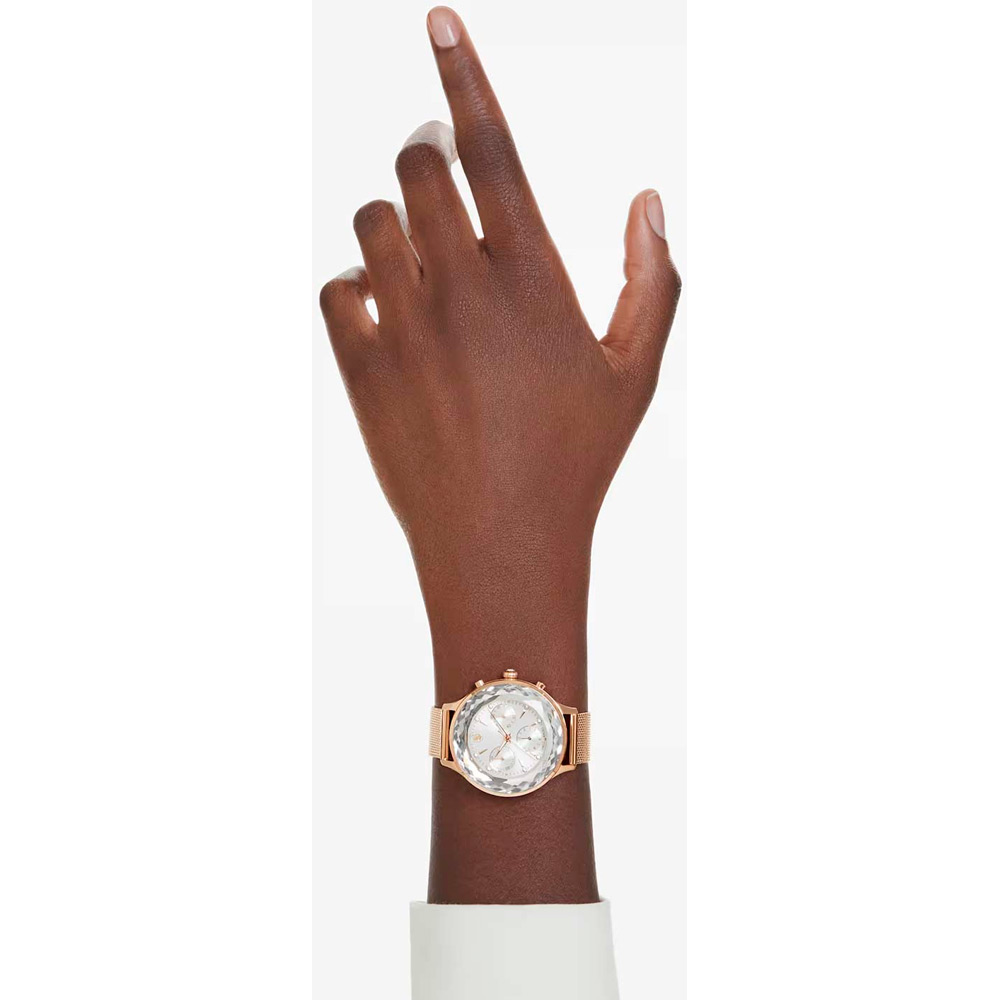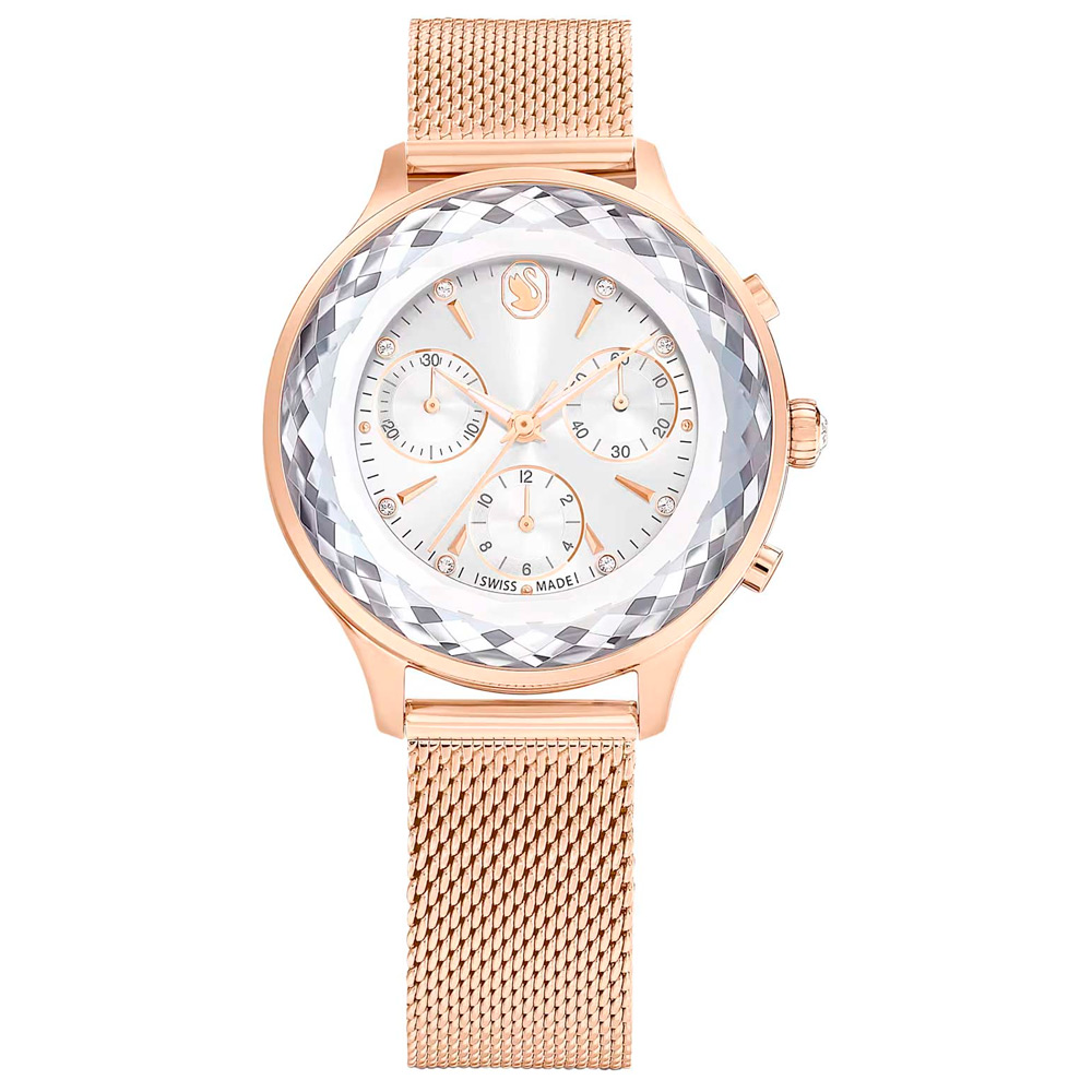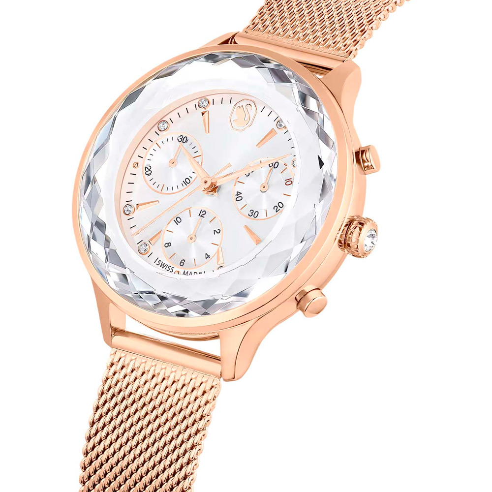 Изысканный аксессуар является универсальным выбором как для работы, так и для отдыха. Женские часы-хронограф с секундомером. Стальной круглый корпус эффектно сочетается с ограненным кристальным безелем. Циферблат выполнен по технологии Sunray (солнечные лучи), украшен логотипом Swarovski в виде лебедя в положении 12 часов. Метки в виде штрихов и точек с кристаллами. Три счетчика хронографа предназначены для отдельного измерения часов, минут и секунд. Стрелки с люминесцентным покрытием LumiNova, которое светится в темноте после непродолжительной зарядки на свету. Рифленая заводная головка украшена сверкающим кристаллом круглой огранки. Стальной браслет миланского плетения.