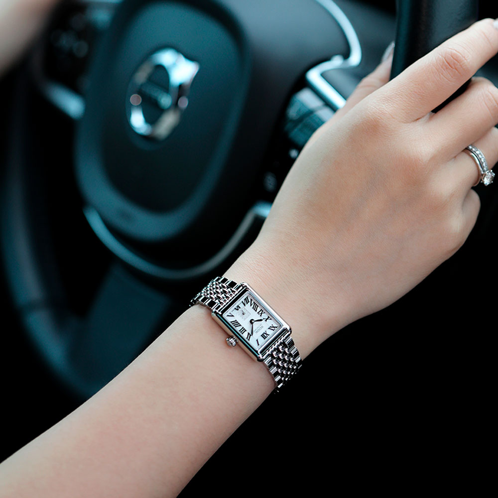 Женские кварцевые часы с прямоугольным корпусом. Секундная стрелка вынесена на отдельный циферблат. Циферблат с метками в виде римских цифр защищен прочным сапфировым стеклом. Рифленая заводная головка. Браслет с раскладывающейся застежкой.