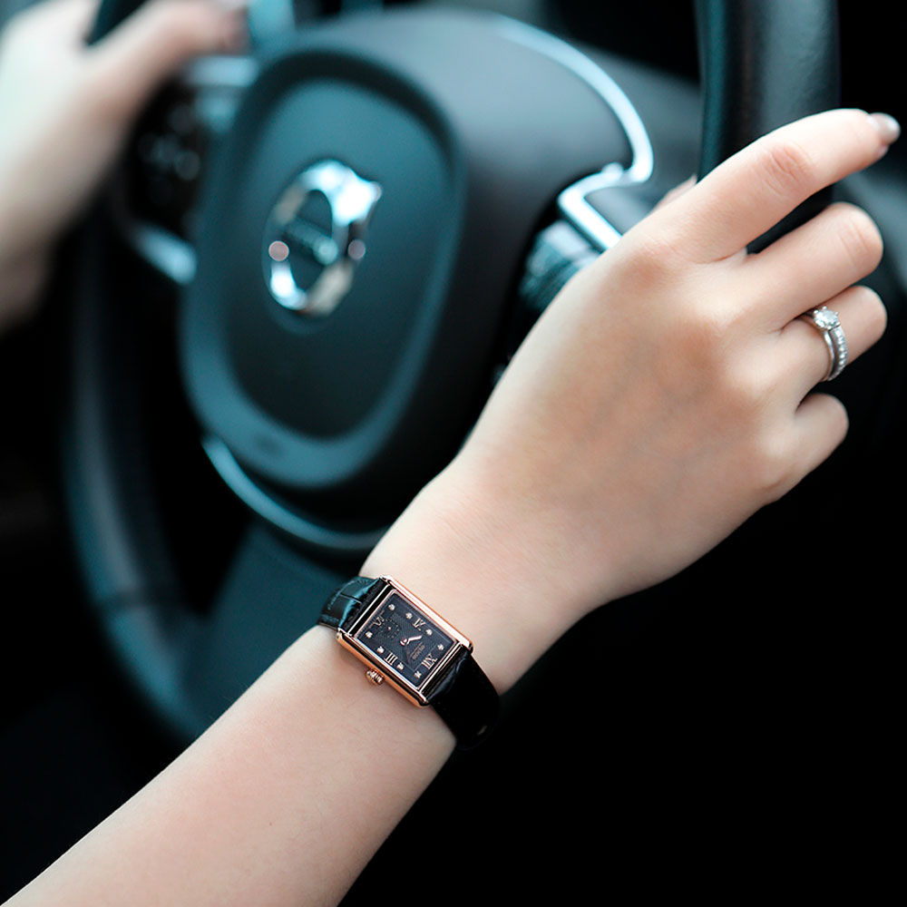 Женские часы с прямоугольным корпусом. Секундная стрелка вынесена на отдельный циферблат. Циферблат защищен прочным сапфировым стеклом. Метки в виде римских цифр и точек, инкрустированных синтетическими бриллиантами. Рифленая заводная головка. Ремешок с классической застежкой.