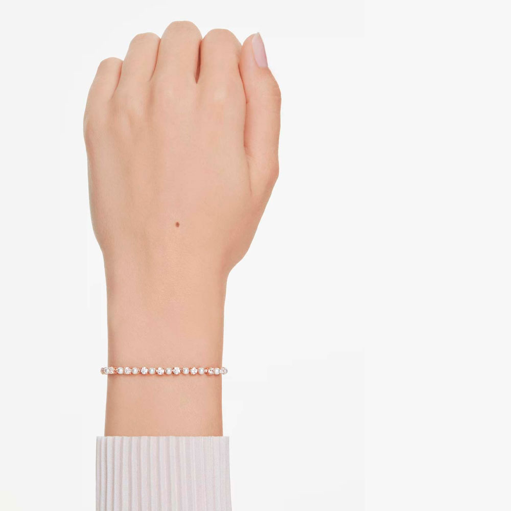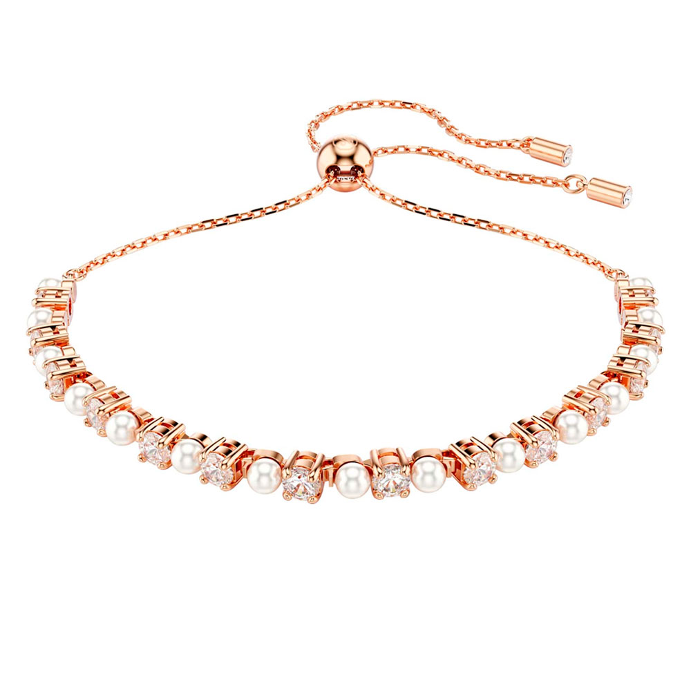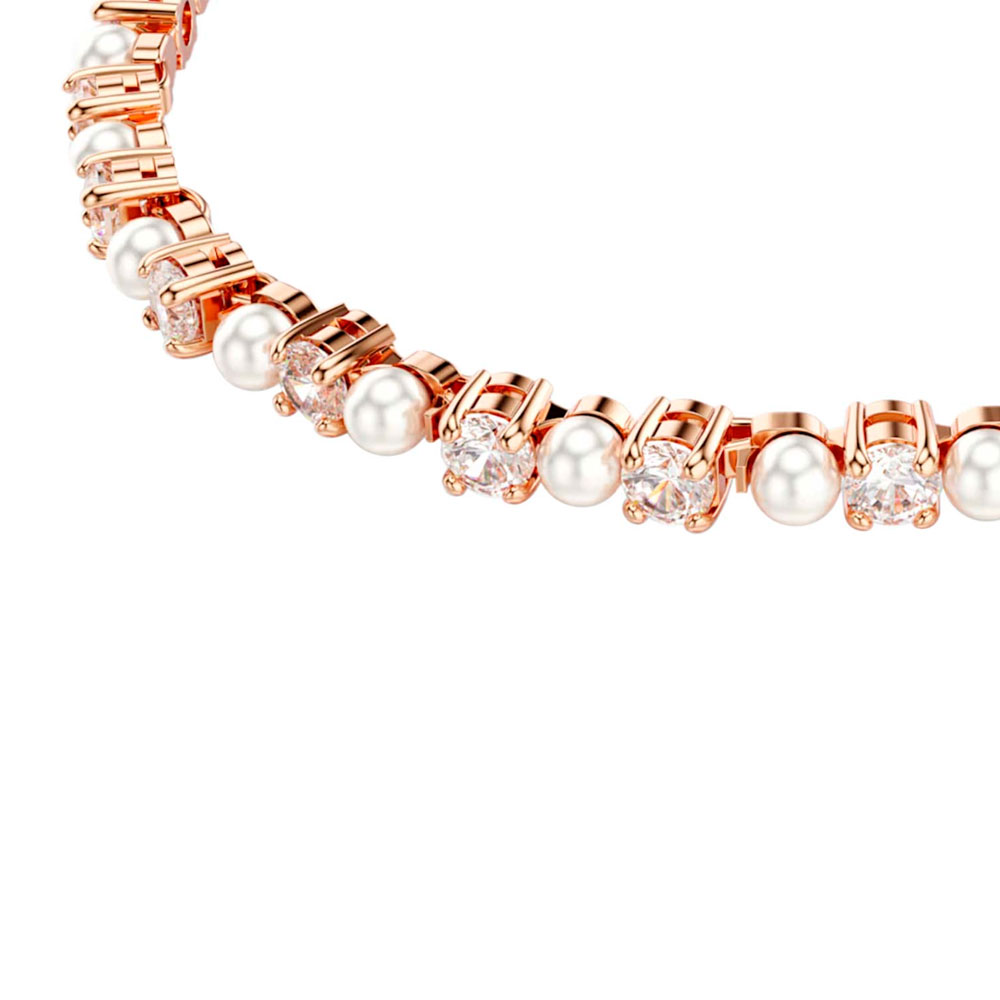 Теннисный браслет из коллекции Matrix с позолотой украшен россыпью кристаллов и жемчужин Swarovski. Застежка - слайдер. Регулируемая длина.