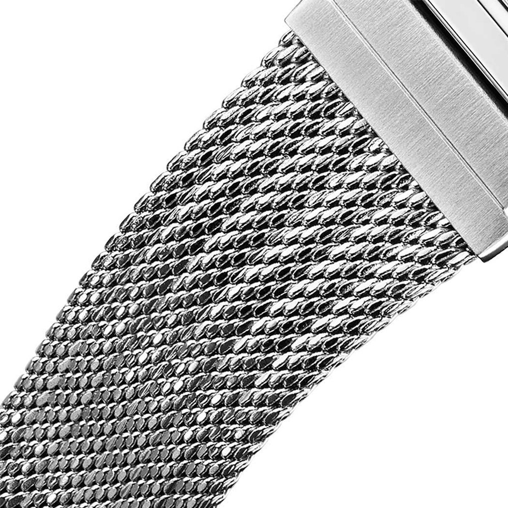 Корпус выполнен в компактном ретроформате, а стальной браслет миланского плетения придаёт часам лёгкость, комфорт и винтажный характер. Такое исполнение подчёркивает утончённость модели и обеспечивает удобную посадку на запястье. Циферблат с аналоговой и цифровой зонами остаётся хорошо читаемым и сбалансированным по дизайну.